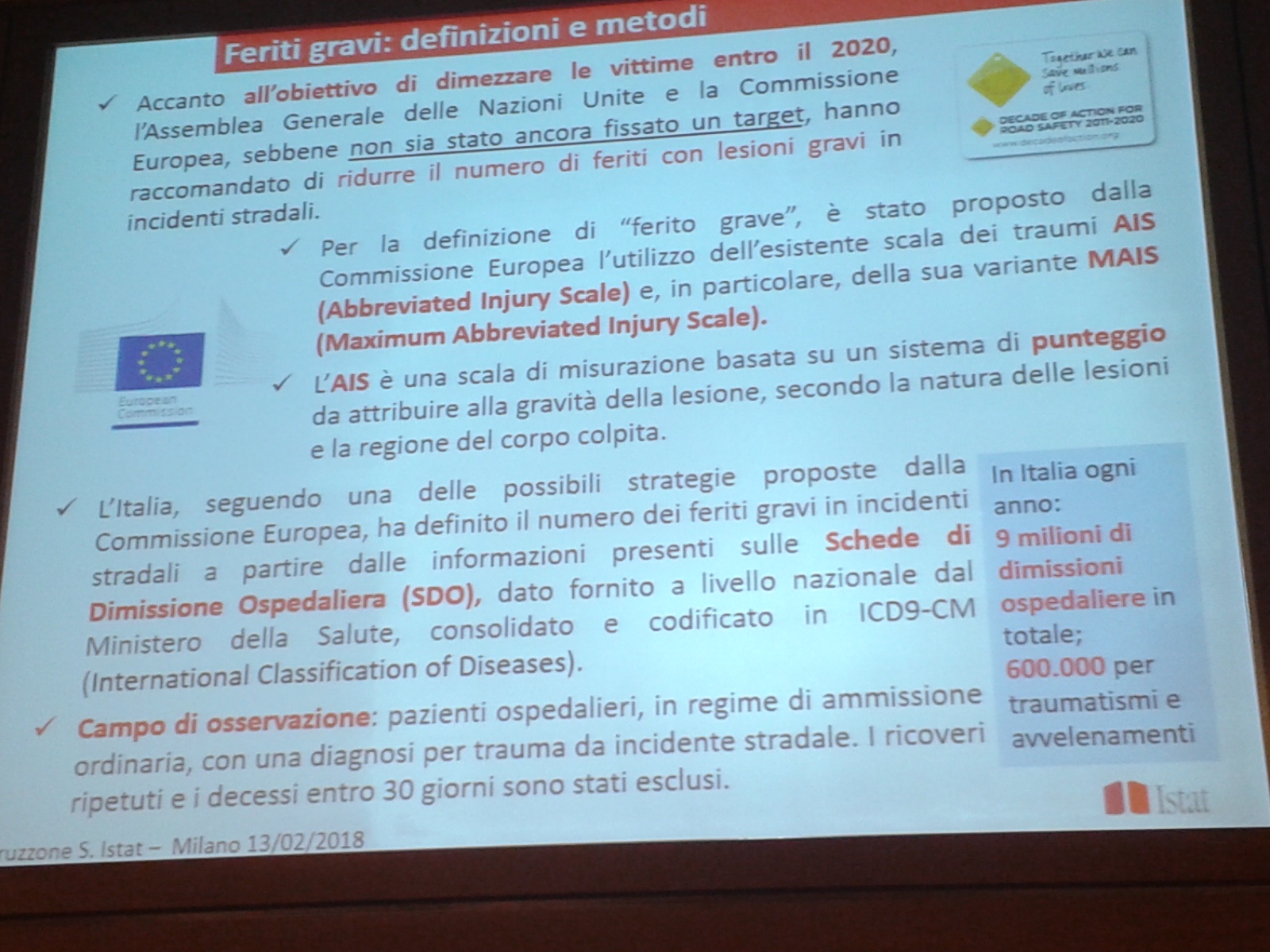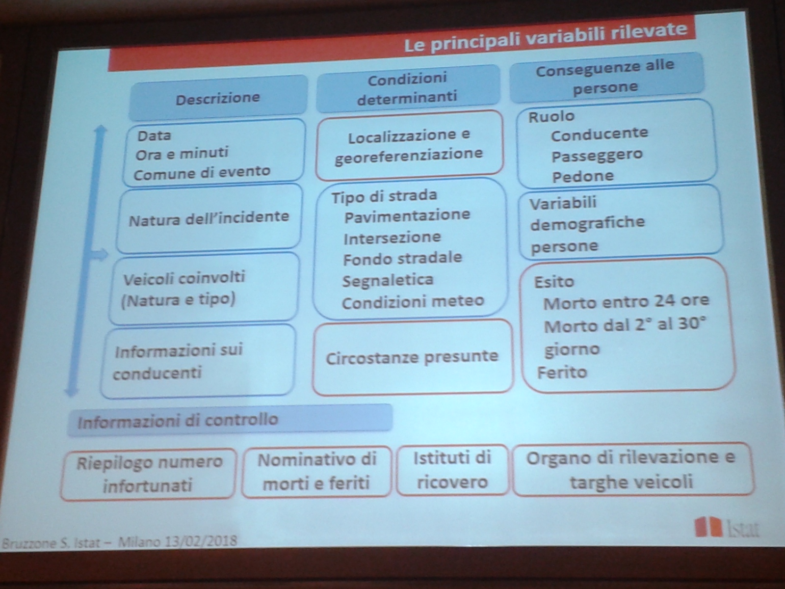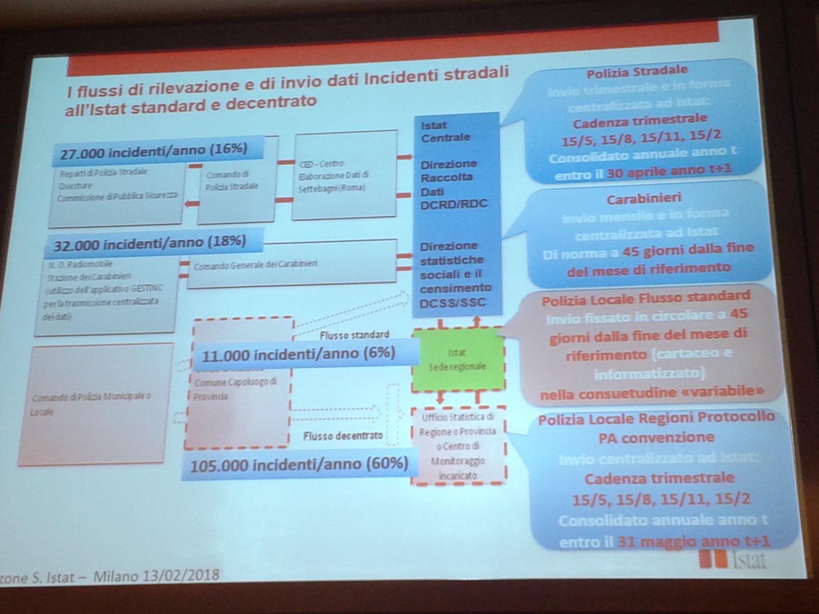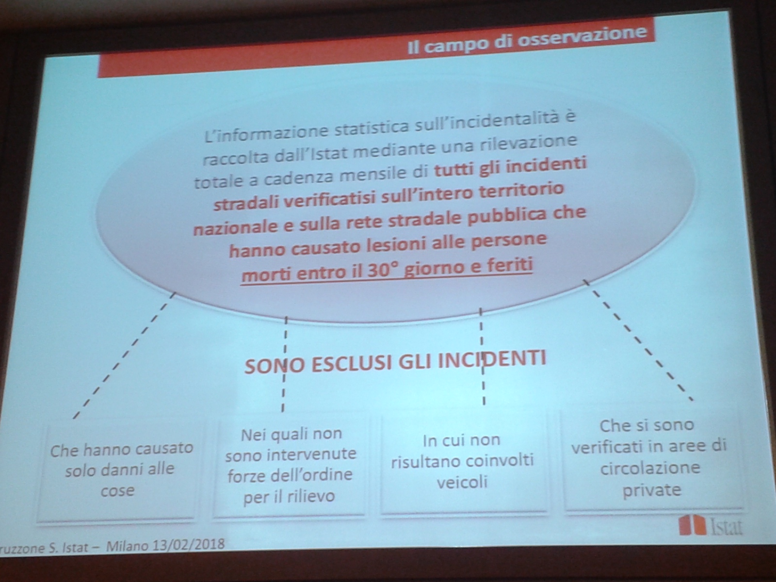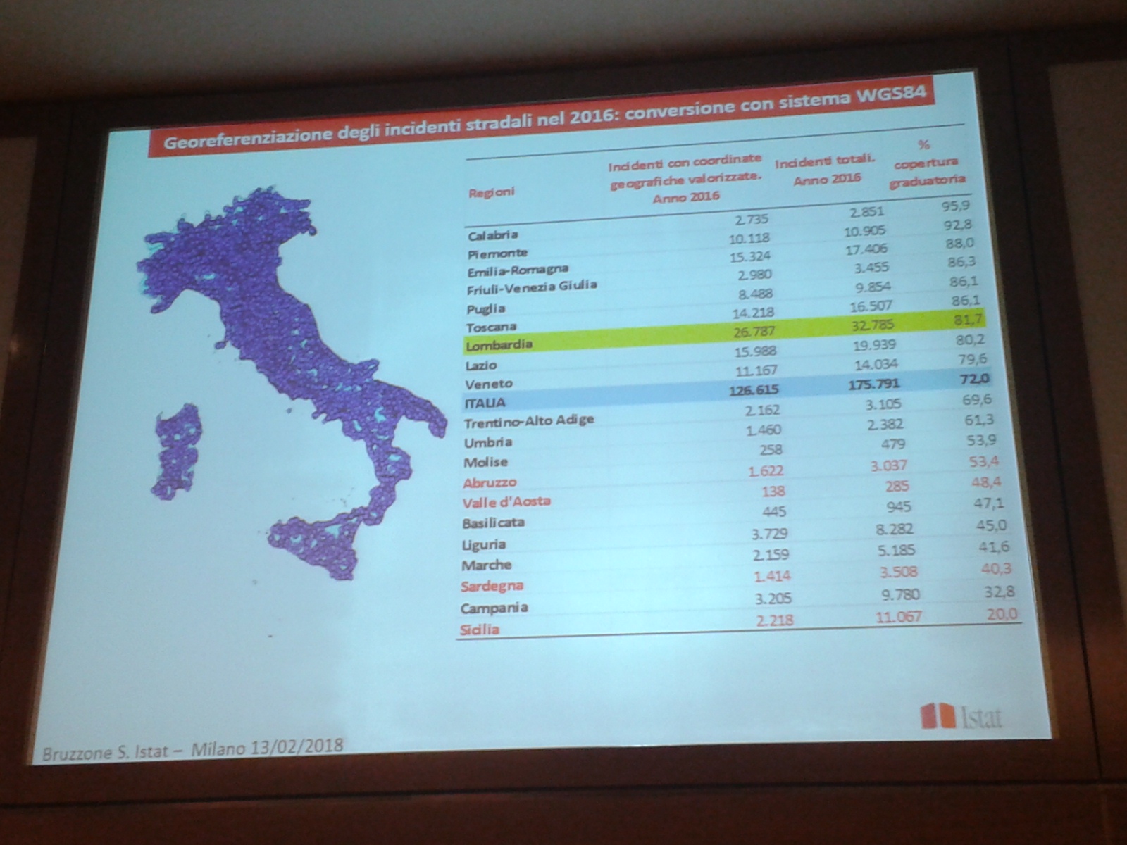 Silvia Bruzzone, responsabile Rilevazione nazionale degli incidenti stradali dell’Istat, dopo aver ricordato come nel 2016 in Lombardia gli incidenti stradali siano stati 32.785 causando 434 morti e 45.435 feriti, ha evidenziato come il maggior numero di incidenti si sia verificato in ambito urbano (25.879, il 78,9% del totale) con 234 morti e 34.416 feriti.