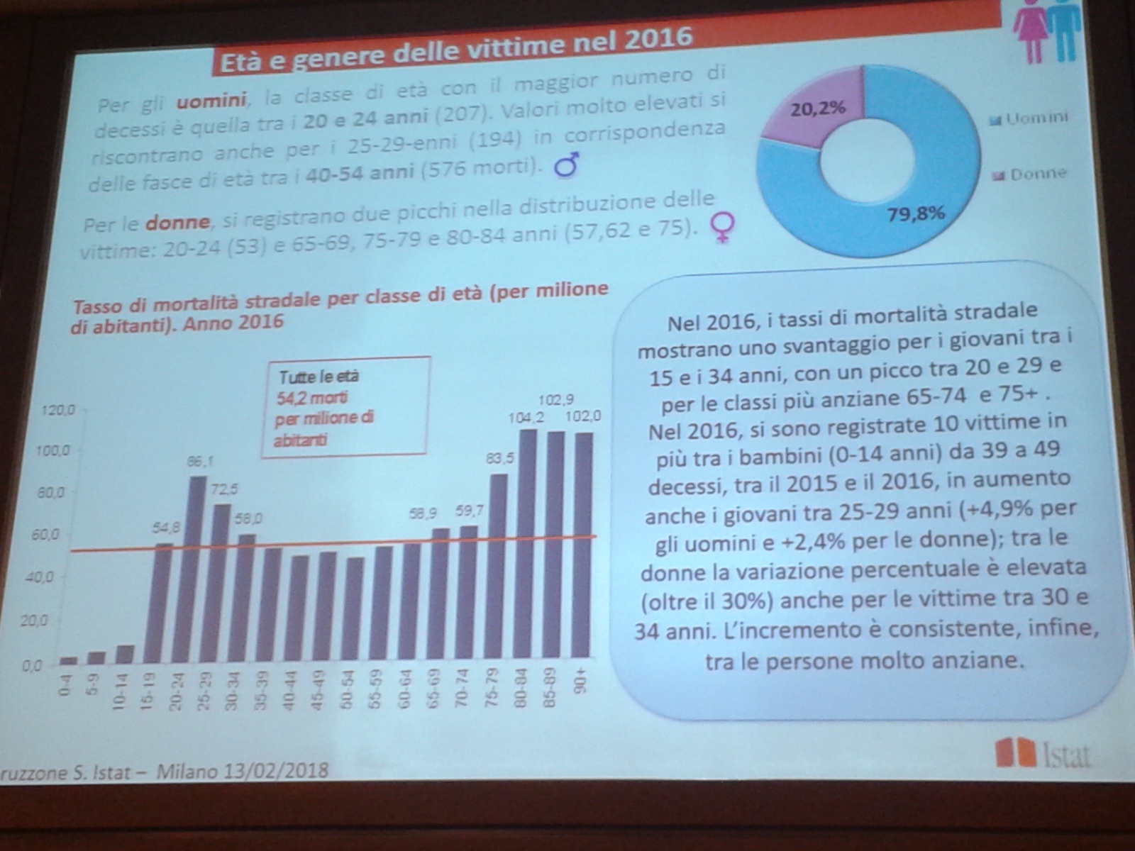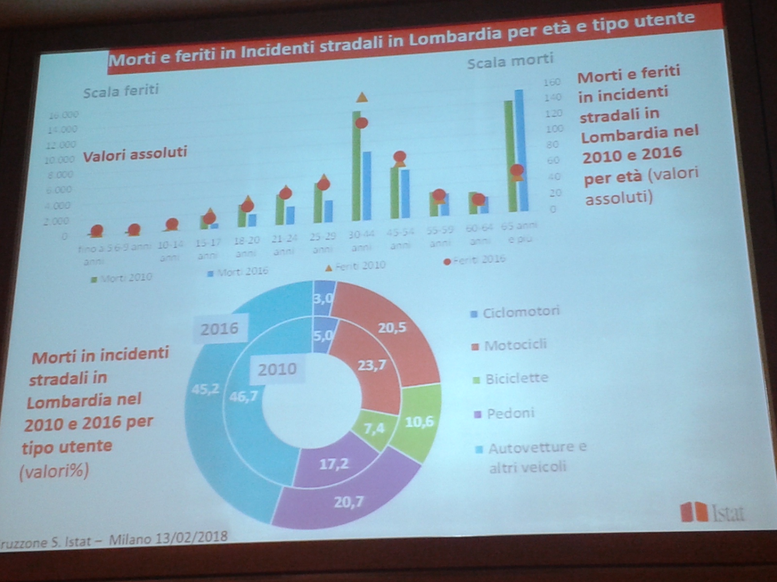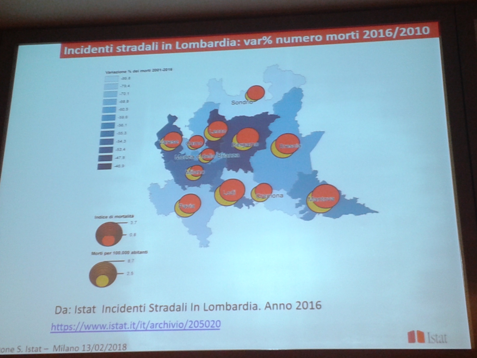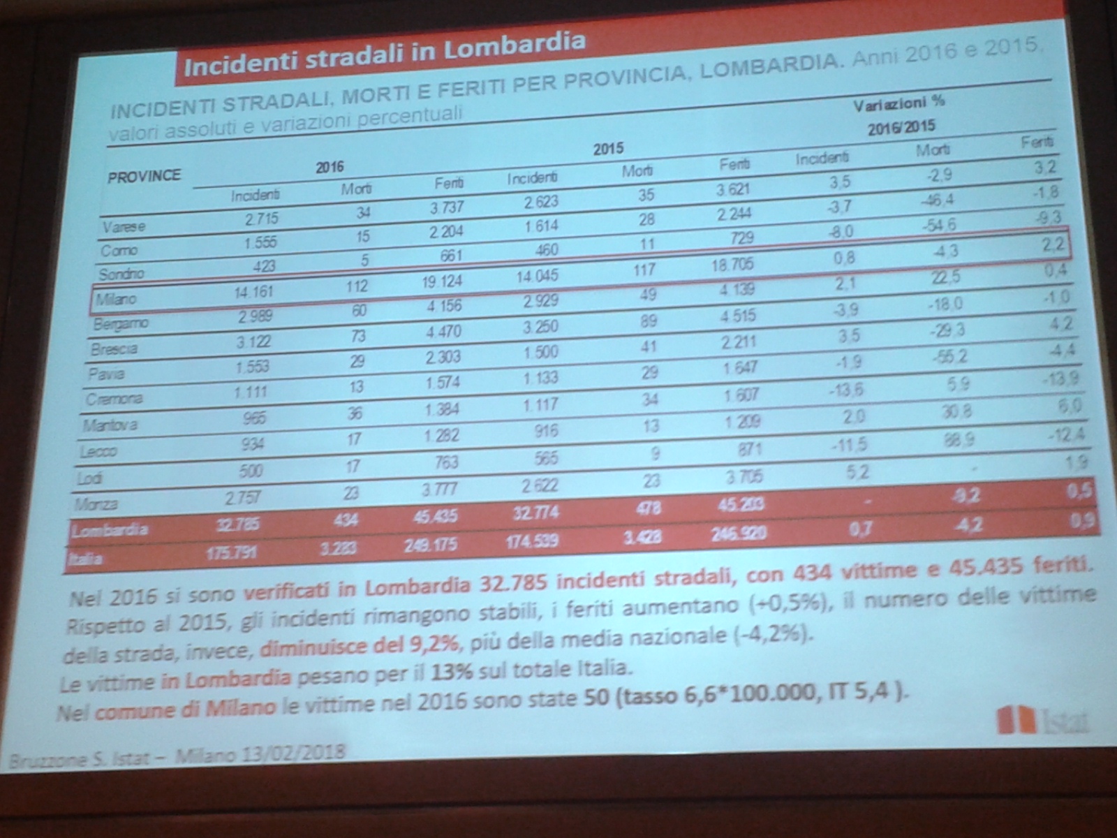 Silvia Bruzzone, responsabile Rilevazione nazionale degli incidenti stradali dell’Istat, dopo aver ricordato come nel 2016 in Lombardia gli incidenti stradali siano stati 32.785 causando 434 morti e 45.435 feriti, ha evidenziato come il maggior numero di incidenti si sia verificato in ambito urbano (25.879, il 78,9% del totale) con 234 morti e 34.416 feriti.