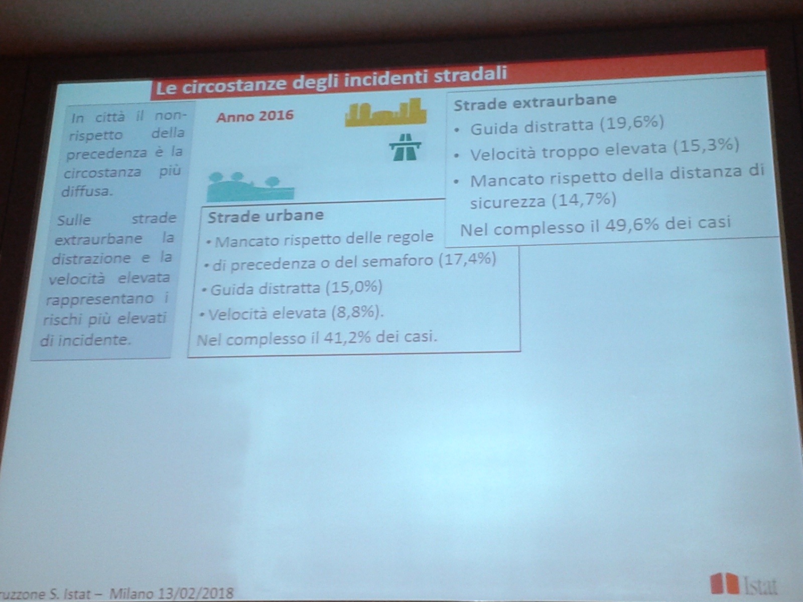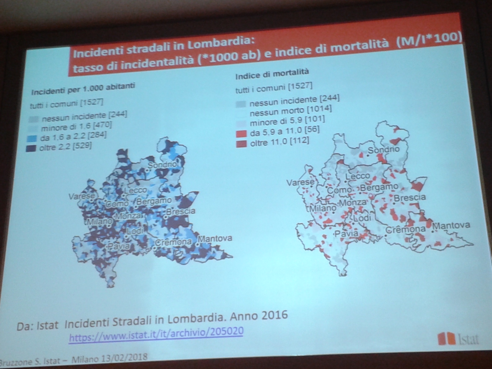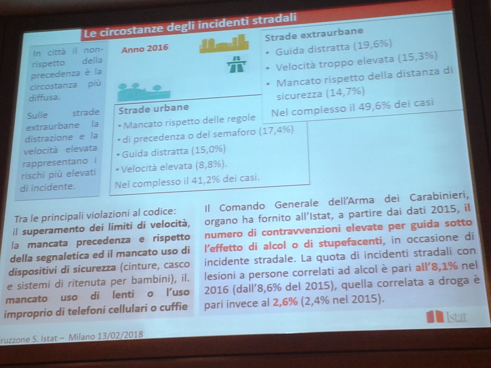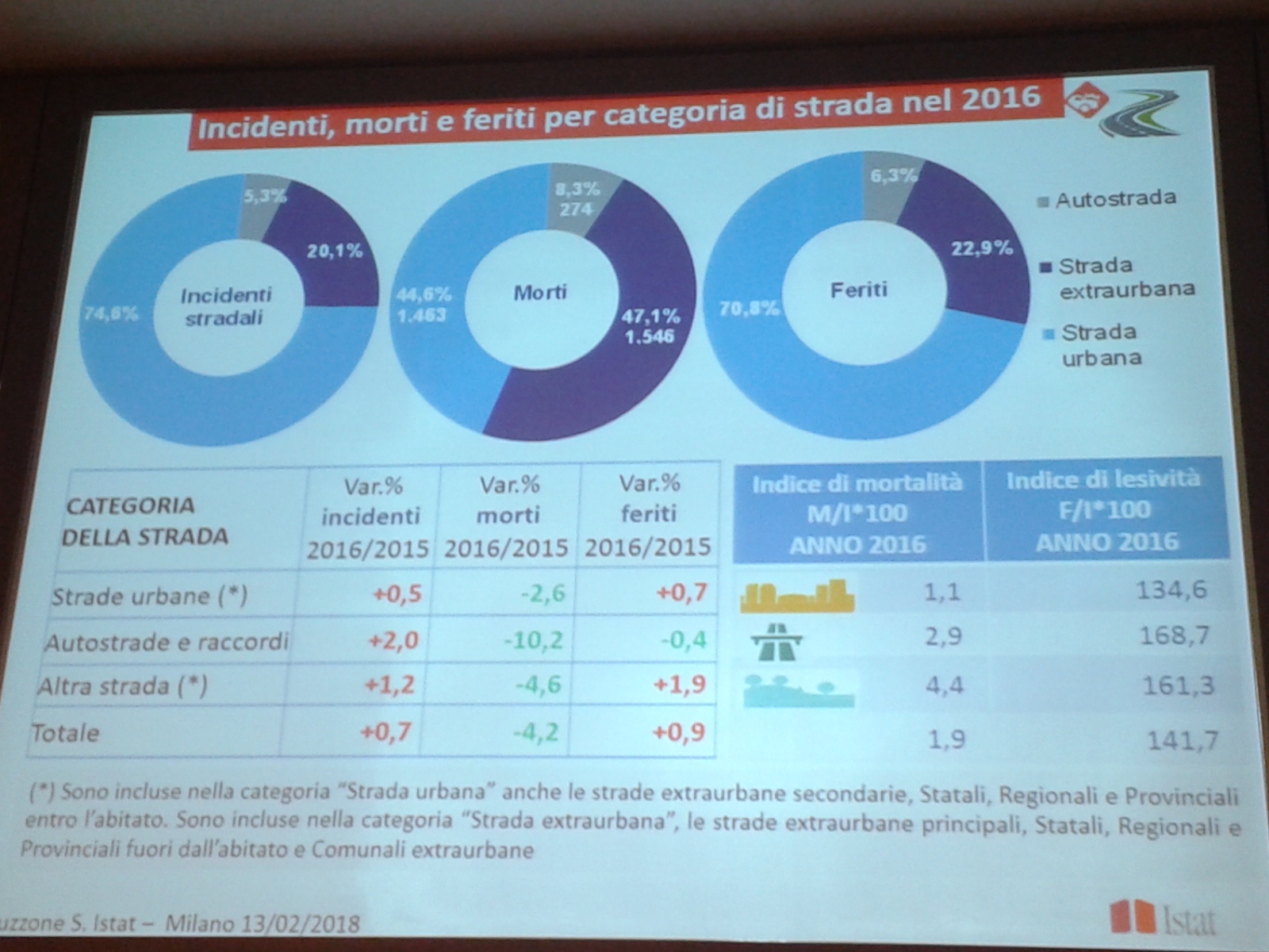 Silvia Bruzzone, responsabile Rilevazione nazionale degli incidenti stradali dell’Istat, dopo aver ricordato come nel 2016 in Lombardia gli incidenti stradali siano stati 32.785 causando 434 morti e 45.435 feriti, ha evidenziato come il maggior numero di incidenti si sia verificato in ambito urbano (25.879, il 78,9% del totale) con 234 morti e 34.416 feriti.