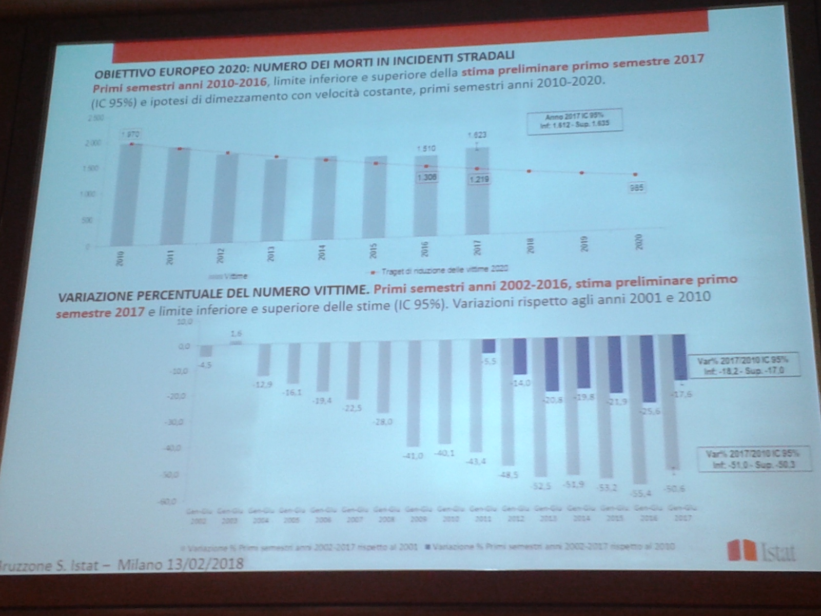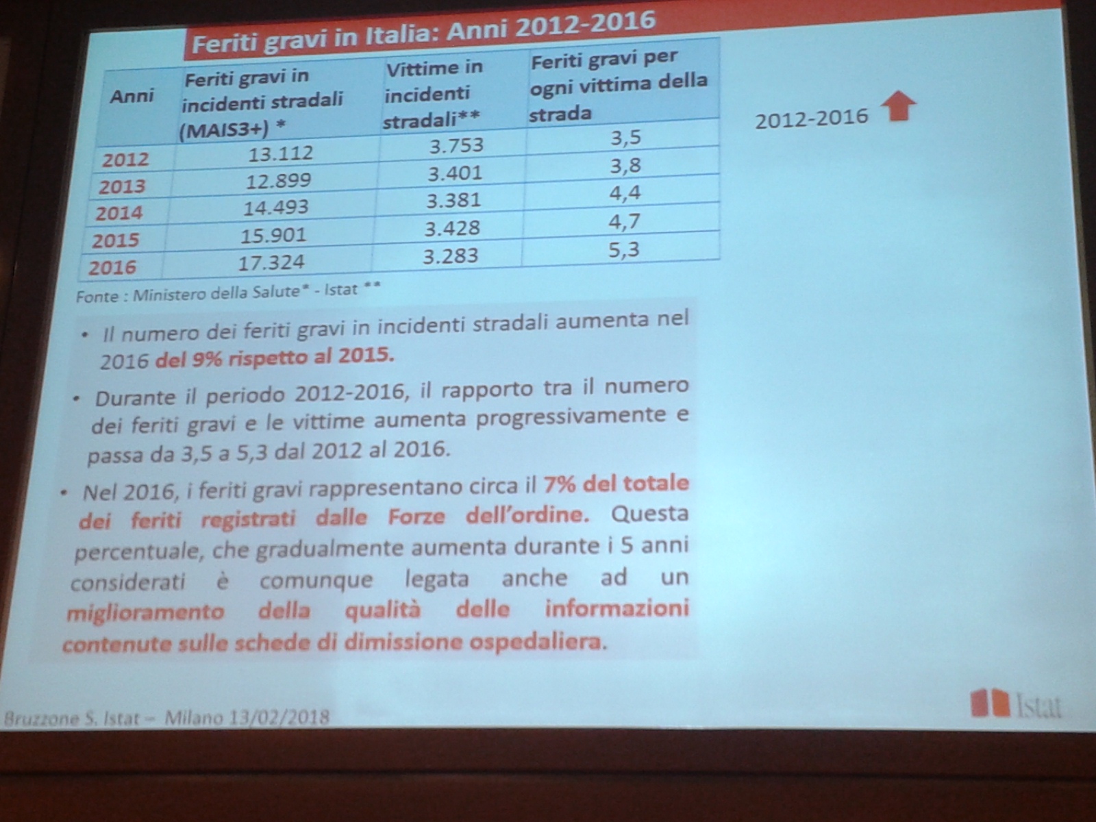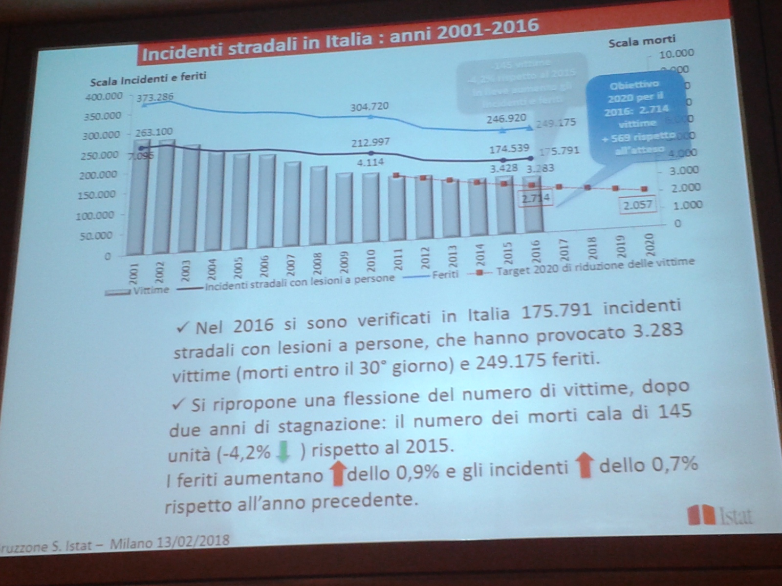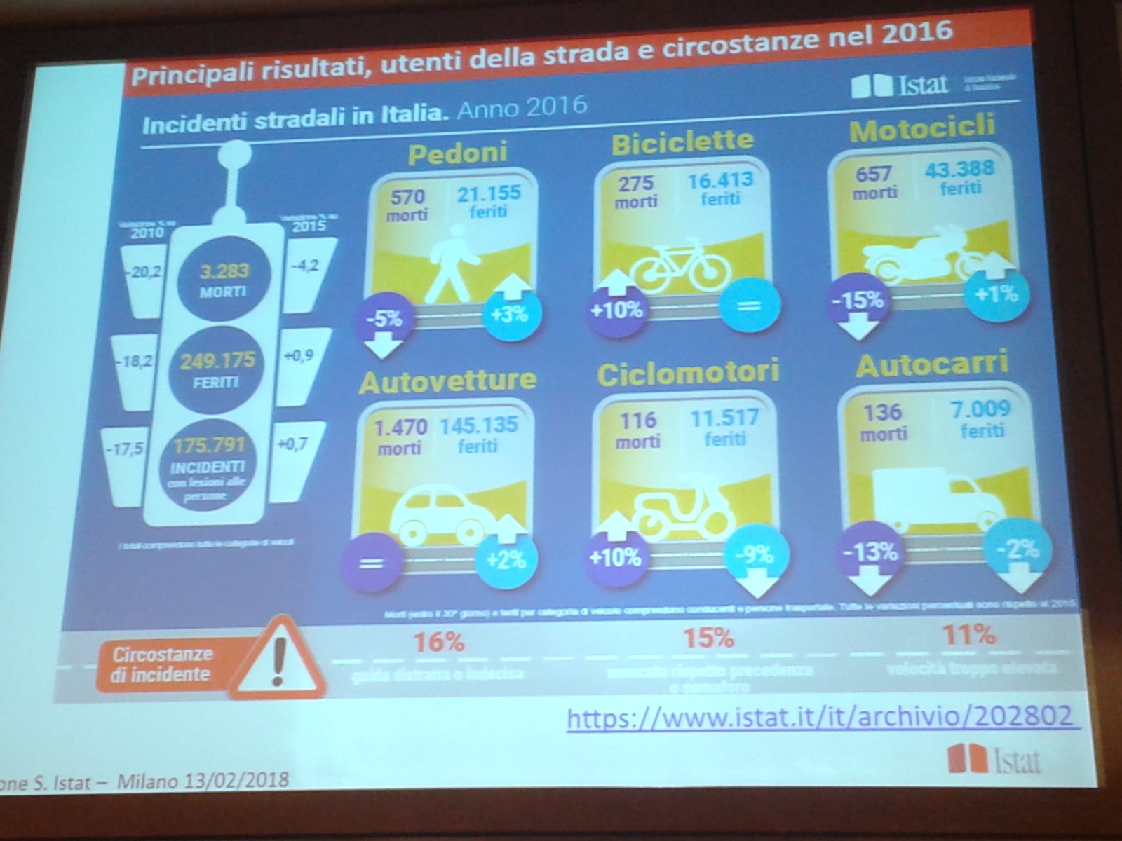 Silvia Bruzzone, responsabile Rilevazione nazionale degli incidenti stradali dell’Istat, dopo aver ricordato come nel 2016 in Lombardia gli incidenti stradali siano stati 32.785 causando 434 morti e 45.435 feriti, ha evidenziato come il maggior numero di incidenti si sia verificato in ambito urbano (25.879, il 78,9% del totale) con 234 morti e 34.416 feriti.