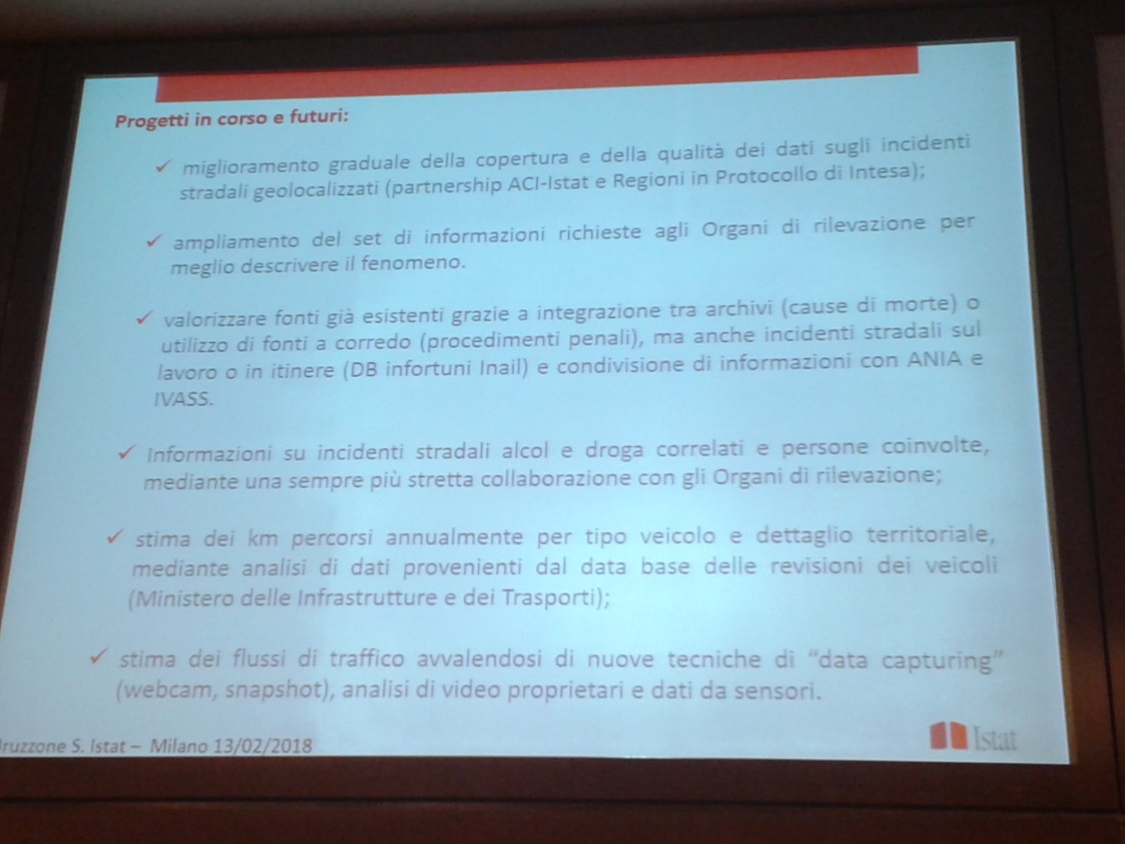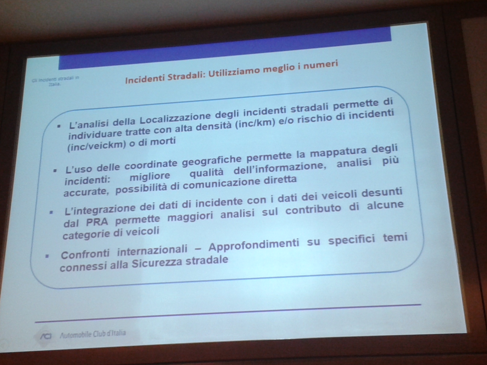 Lucia Pennisi, responsabile Area statistica dell’Automobile Club d’Italia, ha sottolineato l’importanza dell’elaborazione effettuata per localizzare gli incidenti stradali sulla rete viaria principale particolarmente utile per individuare le tratte più a rischio incidenti su cui effettuare le ispezioni. In Lombardia questa rete stradale si contraddistingue per un’alta densità di incidenti (con 1,35 incidenti per chilometro che è pari due volte la media nazionale) con un indice di mortalità pari a 2,34. I km più a rischio incidenti si trovano sulle tangenziali est e ovest milanesi e sulle strade statali 36 del lago di Como, 35 dei Giovi, 9 Emilia, 336 dell’Aeroporto della Malpensa.