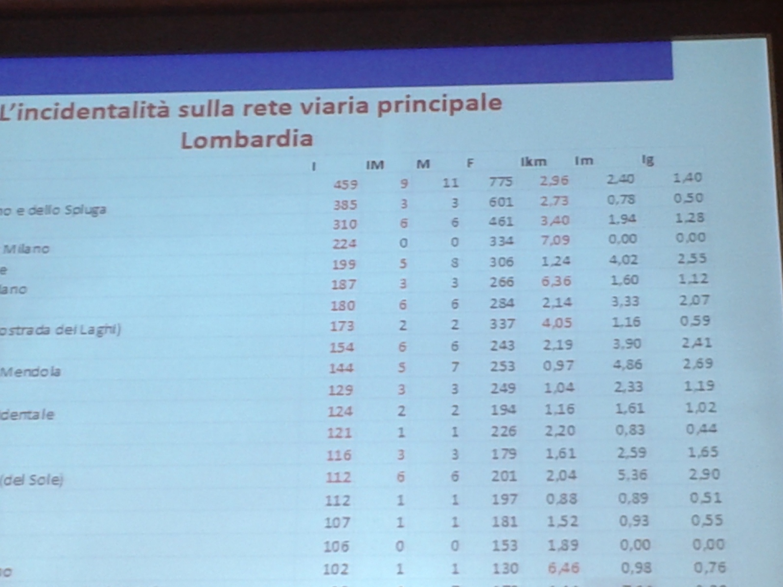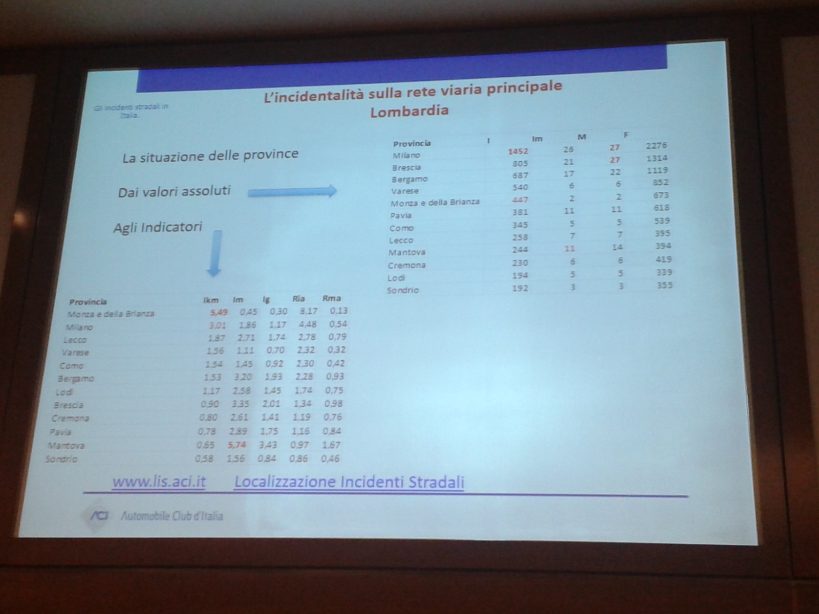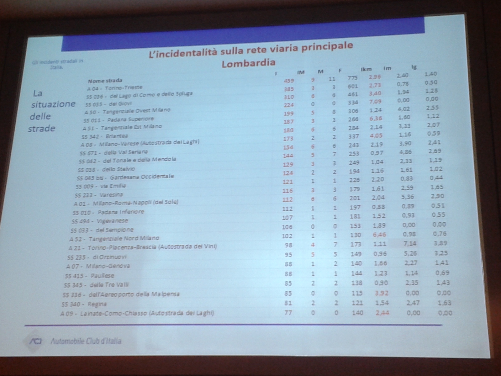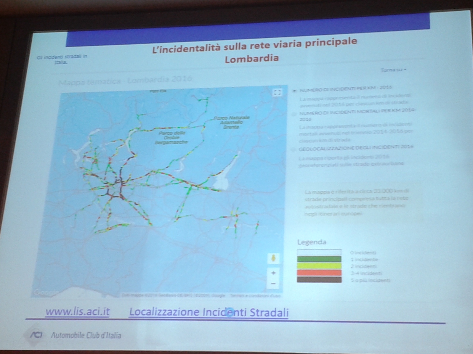 Lucia Pennisi, responsabile Area statistica dell’Automobile Club d’Italia, ha sottolineato l’importanza dell’elaborazione effettuata per localizzare gli incidenti stradali sulla rete viaria principale particolarmente utile per individuare le tratte più a rischio incidenti su cui effettuare le ispezioni. In Lombardia questa rete stradale si contraddistingue per un’alta densità di incidenti (con 1,35 incidenti per chilometro che è pari due volte la media nazionale) con un indice di mortalità pari a 2,34. I km più a rischio incidenti si trovano sulle tangenziali est e ovest milanesi e sulle strade statali 36 del lago di Como, 35 dei Giovi, 9 Emilia, 336 dell’Aeroporto della Malpensa.