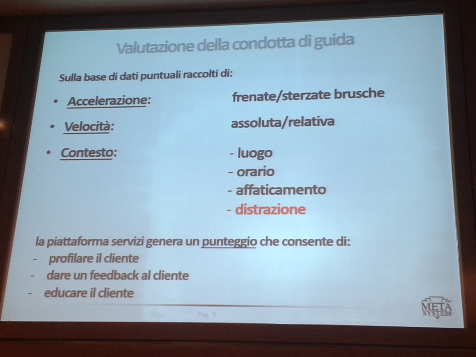 Ne hanno parlato i rappresentanti di due aziende aderenti all’ANFIA – Associazione Nazionale Filiera Industria Automobilistica: Tina Martino per Octo Telematics, Riccardo Tranquillini e Massimo Zenobi per Meta System. Sono stati illustrati, in particolare, gli sviluppi delle scatole nere evolute, approfondendo il loro apporto ad una maggiore responsabilità individuale e collettiva.