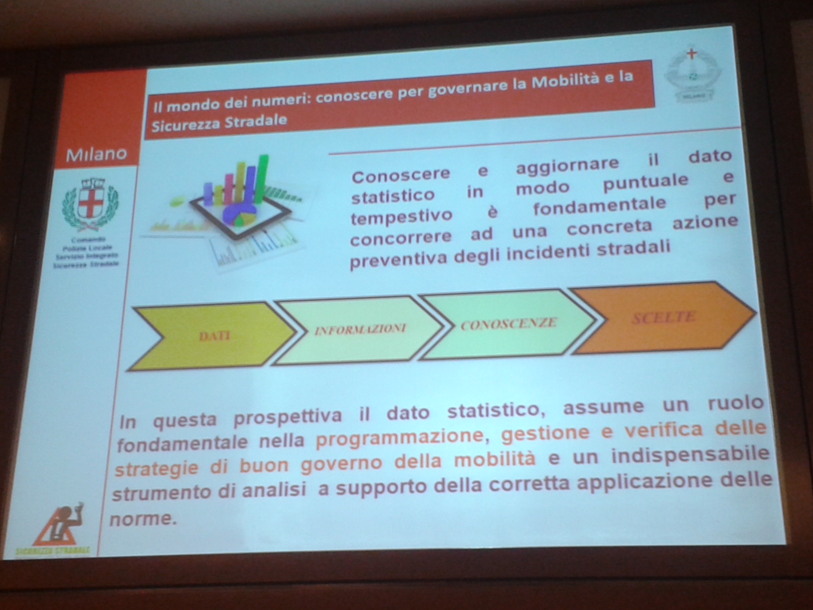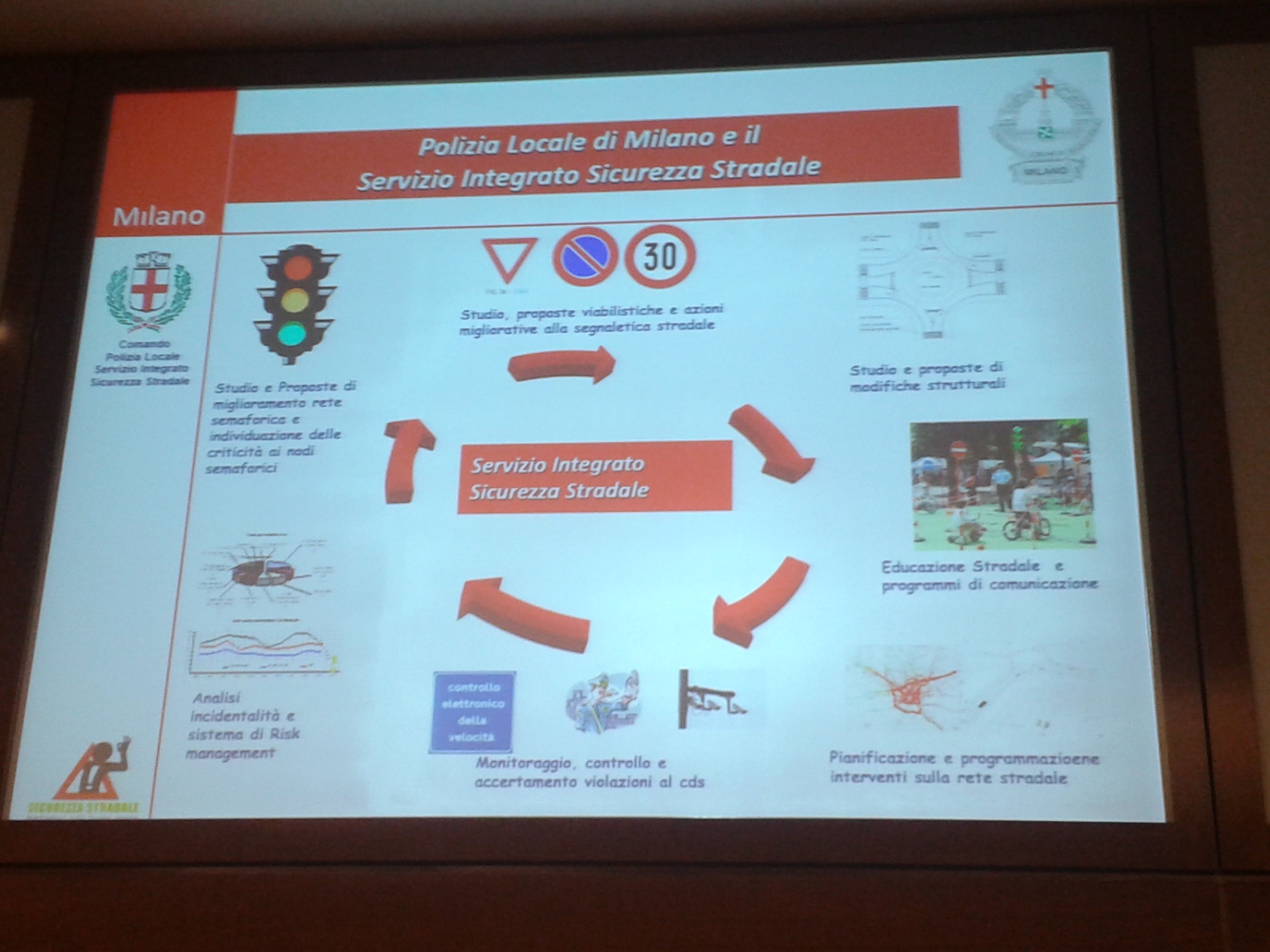 Il commissario capo della Polizia Locale del Comune di Milano Pietro Garbagnati ha infine illustrato come a Milano “percorsi virtuosi per migliorare la sicurezza sulle strade urbane – sviluppando opere di riqualificazione urbana organiche e omogenee tra loro, intervenendo in modo ragionato sulla moderazione del traffico e rimodellando la rete stradale a favore di una concreta riduzione della sinistrosità – prendano avvio proprio dalla ricca banca dati informatizzata della Polizia Locale di Milano, che dal 1992 raccoglie e analizza tutti gli incidenti che si verificano all’interno dei confini comunali, integrata da un sofisticato sistema di risk management del territorio“.