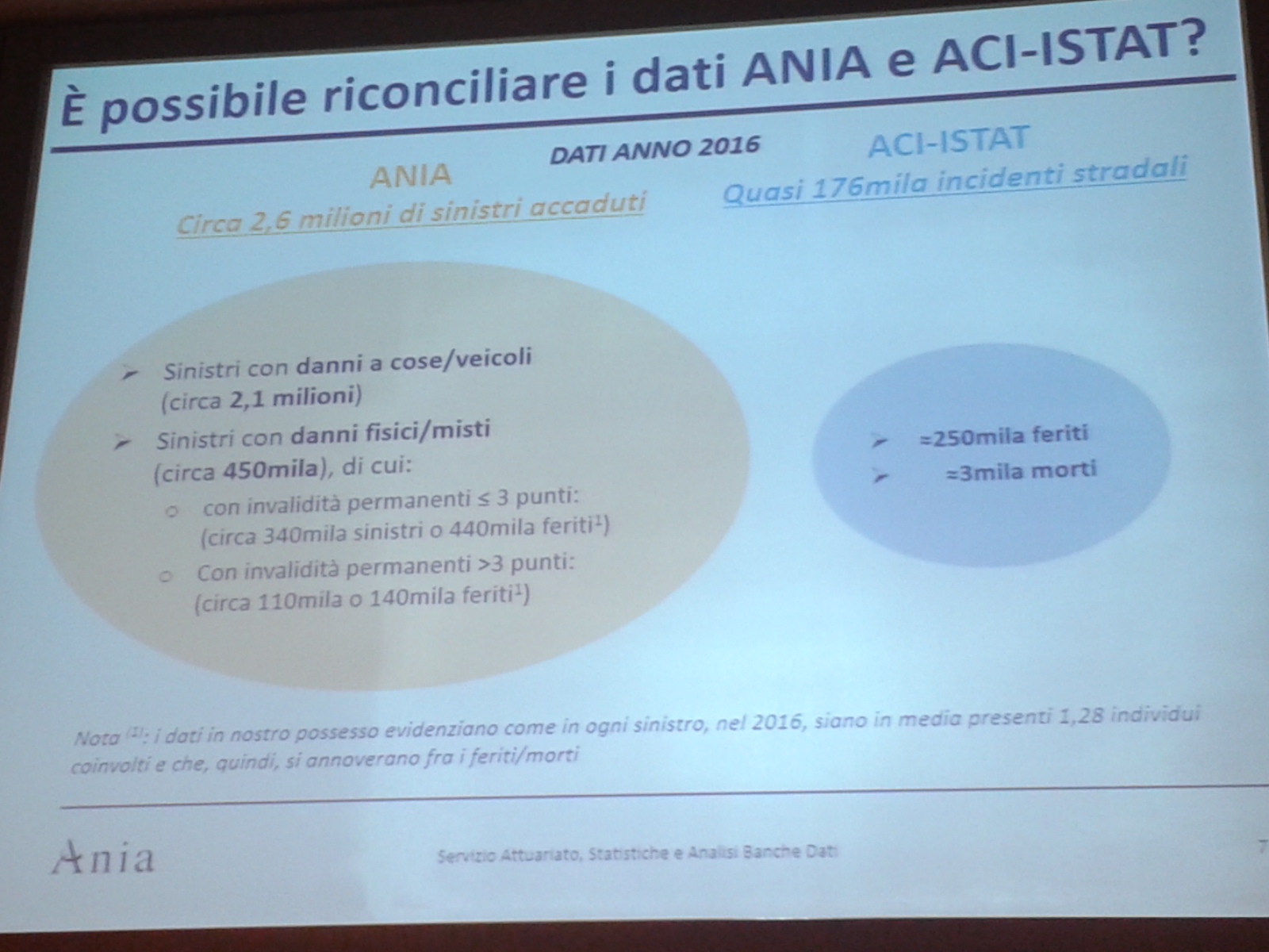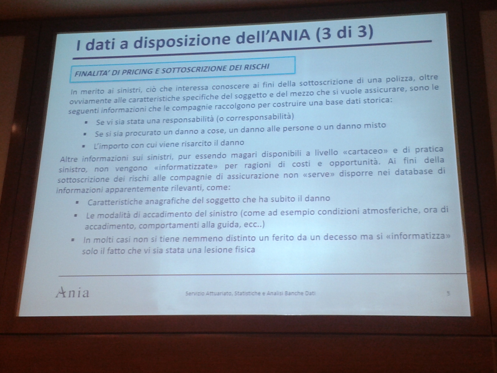 Un possibile punto di contatto fra le esigenze delle varie banche dati è stato identificato da Stefano Desantis, dirigente responsabile Servizio Attuariato, Statistiche e Analisi banche dati dell’Ania, nella “creazione di un database di raccolta dati circa l’incidentalità stradale che, ancorché limitato a fattispecie di incidente con determinate caratteristiche (es. incidenti che abbiano causato solo danni fisici alla persona) sia il più esaustivo e rappresentativo possibile del fenomeno oggetto di analisi”.