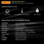 L’inizio della sessione è stato posticipato di tre ore, proprio a causa della nevicata durante la notte, che è proseguita per tutta la mattinata. La pista è stata aperta a mezzogiorno, ma è passata più di un’ora prima che la prima macchina lasciasse i box, quella di Alonso, appunto, che ha completato un giro. Lo spagnolo è stato seguito da Daniel Ricciardo, Marcus Ericsson, Robert Kubica e Brendon Hartley. Ma non si è trattato di veri e propri test, un giro e rientro praticamente per tutto il tempo e solo nell’ultimo quarto d’ora Alonso è rimasto in pista per più di un giro, segnando un tempo di 2m21.268s sulle full wet, poi abbassato a 2m18.545s.