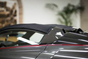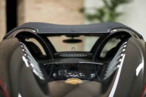 Ispirata alle prime macchine volanti ideate da Leonardo – tale l’Ornitottero -, come a certe celebri opere architettoniche e d’Ingegneria contemporanee, la Cappottina è un assieme di componenti in Fibra di Carbonio ad Alto Modulo Elastico, sviluppati da Pagani, collegati tramite cerniere ricavate dal pieno in Alluminio e Titanio, che vanno a tendere il tessuto tecnico sviluppato da Dainese.
