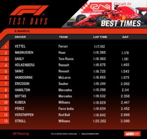 Per Sebastian Vettel i test pre-stagione sono conclusi e il suo prossimo appuntamento con la SF71H sarà a Melbourne, per le prove libere del GP Australia. L’ultima giornata di prove del tedesco si traduce nel completamento di un programma che comprendeva prove di assetto e di pneumatici con diversi carichi di carburante, la classica simulazione di un weekend di gara che conclude, per ogni pilota, le prove invernali. A fine giornata, Vettel ha coperto ben 188 giri (pari a oltre 875 km) in tutte le condizioni, compreso un test di falsa partenza con altre vetture in pista. Il miglior passaggio è stato in 1’17”182, con le nuove mescole hypersoft al debutto in questa stagione, tempo che è diventato il nuovo record del circuito di Barcellona, dopo quello fatto ieri dalla Red Bull di Daniel Ricciardo.