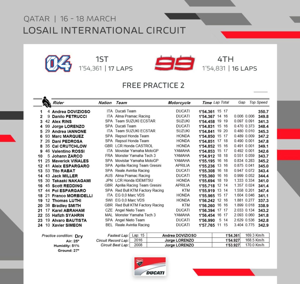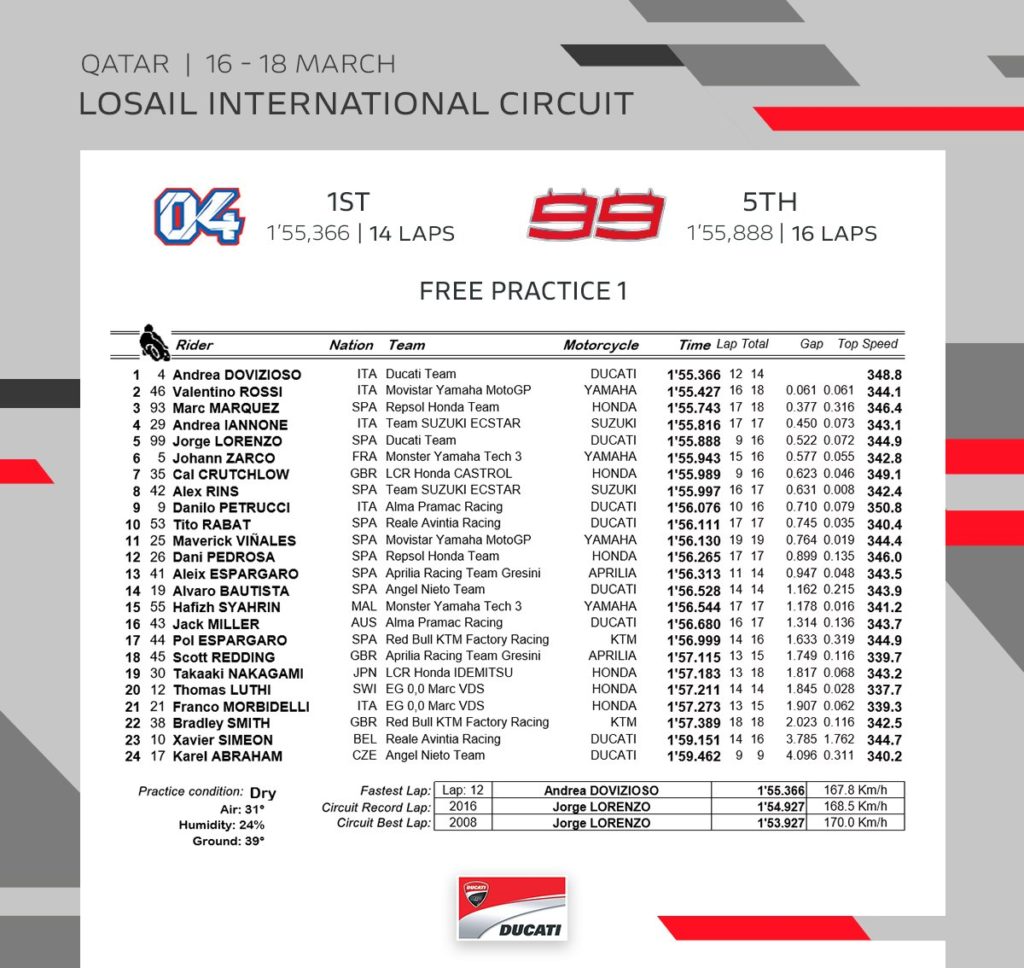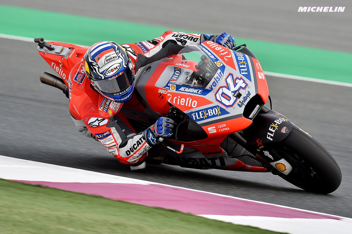 Il pilota del Ducati Team Andrea Dovizioso inizia il campionato 2018 dominando le libere in Qatar con il tempo di 1.54.36s. È stato un bel test del passo gara con le moto in pista nello stesso orario