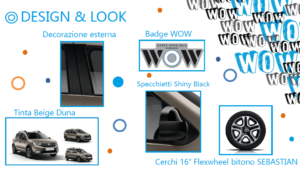 Dacia lancia la nuova Serie Speciale WOW su Sandero, Lodgy e Dokker e arricchisce il suo look con nuovi elementi: nuovi cerchi Flexwheels da 16’’ bitono SEBASTIAN, nuova tinta Beige Duna inedita sui tre modelli, retrovisori Shiny Black e nuove decorazioni esterne e non poteva mancare il Badge WOW che firma la quarta Serie Speciale di Dacia.