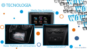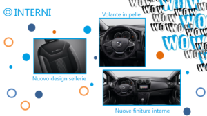 L’attenzione ai particolari e al design si riflettono nei nuovi interni e nelle finiture proposte da questa Serie Speciale. Le nuove sellerie, con un design specifico WOW, richiamano il colore bitono; le cornici della consolle centrale e le bocchette degli aeratori, sono impreziosite da motivi che richiamano il design della Dacia WOW, mentre il volante in pelle garantisce comfort e piacere di guida. Inoltre, tanta tecnologia a bordo di serie, per un allestimento al top della gamma: climatizzatore manuale, retrocamera posteriore, Media Nav Evolution. Per la prima volta, su Sandero è disponibile, in opzione, il nuovo climatizzatore automatico.