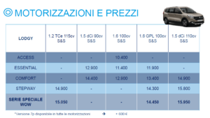 Lodgy WOW è disponibile nelle seguenti motorizzazioni: GPL 1.6 100CV, benzina 1.2 TCe 115CV e diesel 1.5 dCi 110CV. Su Lodgy è possibile scegliere tra le versioni a 5 o 7 posti.