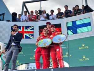 Sarà battaglia, con Hamilton che può contare sul DRS a disposizione, ma Vettel tiene duro e segna il giro veloce al 34° passaggio. Raikkonen intanto deve difendere la terza posizione da Ricciardo, che ha neutralizzato il distacco grazie alla safety car. Davanti, la lotta è sul filo dell’attivazione dell’ala mobile: chi sta dietro può usarla, ma girando in scia rischia il surriscaldamento. Hamilton non molla e Vettel risponde con il giro più veloce (45°), con l’avversario che lo bracca al punto di perdere l’avantreno in frenata e perdere quasi 2 secondi. Negli ultimi 5 giri, Vettel guadagna un po’ di terreno, mentre Raikkonen ha un margine di meno di 2 secondi da gestire, ma riesce anche ad avvicinarsi a Hamilton, che ormai punta a conservare la seconda posizione. Alla fine, primo e terzo posto per i due ferraristi.