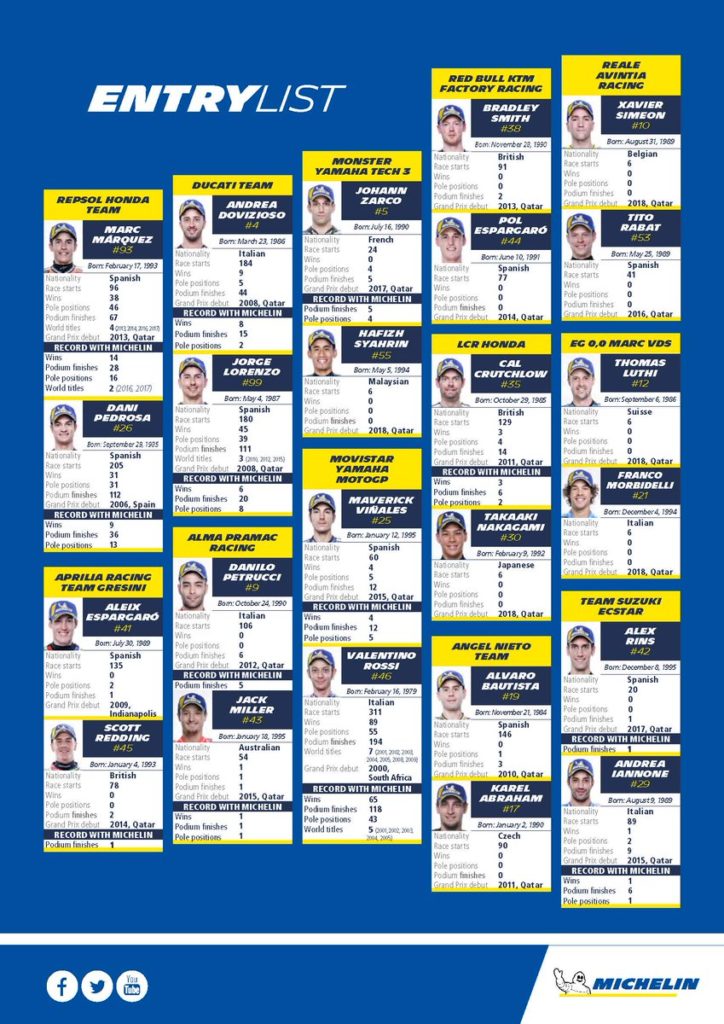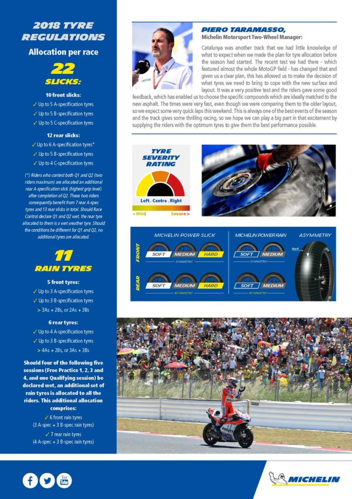 Piero Taramasso, manager Michelin Motorsport:“Quello di Catalunya è un nuovo circuito per noi. I recenti test che abbiamo fatto di recente su questa pista, con praticamente tutti i piloti della classe regina, ci hanno dato una idea più chiara da cosa provare per questo appuntamento su un tracciato modificato. Le prove ci hanno dato dei buoni riscontri con i quali abbiamo creato le mescole giuste per il GP. Ci aspettiamo, come sempre un grande spettacolo grazie ai migliori pneumatici”.