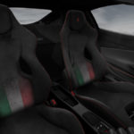 Gli interni, in Alcantara® nera, si caratterizzano per i sedili rivestiti con una speciale Alcantara® traforata che riprendono, nella fascia centrale dello schienale, la bandiera tricolore sfumata. Quest’ultima è ben visibile anche sui tappetini, realizzati in materiale tecnico così come i tappeti, e viene anche utilizzata come elemento distintivo del bordo delle palette del cambio. Sulla base del volante spicca il numero presente sulla livrea esterna mentre tutte le parti in carbonio hanno una finitura opaca. Completano la personalizzazione degli interni una targhetta in carbonio identificativa di questo allestimento e i battitacco, sempre in carbonio, con dedica esclusiva firmati Tailor Made.