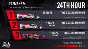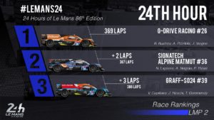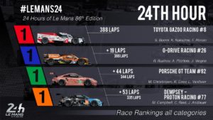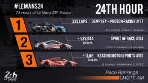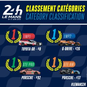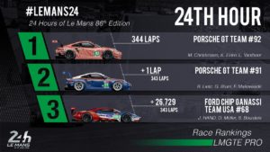 Porsche celebra nel migliore dei modi i suoi 70 anni con una doppietta nella categoria LMGTE Pro e vincendo nella LMGTE Am. Dopo due ore di gara, la gerarchia era già disegnata. La Porsche 911 RSR #92 “Maialino Rosa” è emersa nettamente in testa, in parte grazie alle safety car. La vettura di Michael Christensen, Kévin Estre e Laurens Vanthoor si è ritrovata dietro una prima safety, mentre il resto del gruppo era dietro a un’altra safety. Il vantaggio costruito è rimasto quindi a vantaggio della Porsche che ha riportato in pista una livrea storica che ha portato fortuna. Nel gioco dei cambi pilota e con la gestione complessa delle diverse slow-zone, la Porsche 911 RSR #91 è riuscita a costruirsi un piccolo margine di sicurezza. A completare il podio la Ford GT #68 del Ford Chip Ganassi Team USA.