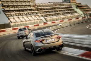 I modelli Quadrifoglio sono già di per sé un concentrato di preziosità tecniche e prestazionali. Ad esempio su Stelvio, per la prima volta, il propulsore 2.9 V6 Bi-Turbo è abbinato all’innovativo sistema di trazione integrale Q4 che garantisce il massimo livello in termini di prestazioni, motricità, piacere di guida e sicurezza in tutte le situazioni. Le vetture sono inoltre dotate dell’unità di controllo AlfaTM Chassis Domain Control che coordina tutta l’elettronica di bordo, per ottenere sempre le migliori prestazioni e il massimo piacere di guida. In particolare, il sistema gestisce e assegna, in contemporanea, compiti specifici ai diversi sistemi attivi quali la trazione integrale Q4 (su Stelvio Quadrifoglio), il sistema AlfaTM Active Torque Vectoring, le sospensioni attive AlfaTM Active Suspension, l’ESC, selettore AlfaTM DNA Pro con funzione Race. La tecnologia Torque Vectoring ottimizza la motricità accentuando il carattere sportivo di Stelvio e Giulia. Le due frizioni, a controllo elettronico contenute nel Torque Vectoring, consentono di controllare separatamente la coppia per ciascuna ruota. In questo modo, la trasmissione della potenza a terra è sempre ottimale in ogni situazione di guida. Ciò permette di condurre l’auto in modo sicuro e sempre molto divertente, senza mai ricorrere a interventi invasivi da parte del controllo di stabilità. Di serie il cambio ZF automatico a 8 rapporti con una calibrazione tale da permettere di effettuare le cambiate in soli 150 millisecondi in modalità Race. La trasmissione è dotata di frizione “lock up” che assicura al guidatore una forte e precisa sensazione di ripresa una volta innestata la marcia. Inoltre, Il nuovo cambio automatico è in grado, a seconda della modalità del DNA, di ottimizzare la fluidità, il comfort e la facilità di guida in tutti gli ambiti di utilizzo, compreso quello urbano, e permette di migliorare ulteriormente i consumi di carburante e le emissioni di CO2. Non solo prestazioni, dunque: sia il SUV sportivo sia la berlina di Alfa Romeo si dimostrano particolarmente efficiente nelle emissioni e nei consumi, anche grazie al sistema di disattivazione dei cilindri a controllo elettronico e alla funzione “sailing”, disponibile in modalità di guida Advanced Efficiency. Infine, per massimizzare l’esperienza di guida, entrambe offrono le leve del cambio in alluminio ricavato dal pieno, solidali al piantone di sterzo.