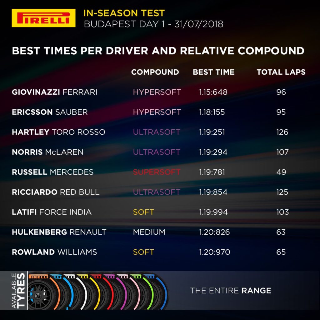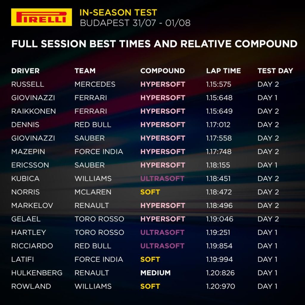 La due giorni di test in-season all’Hungaroring si è conclusa con il miglior tempo di George Russell su Mercedes con i P Zero Pink hypersoft (1m15.575s), che è stato anche il migliore dell’intero test e un nuovo record assoluto della pista.