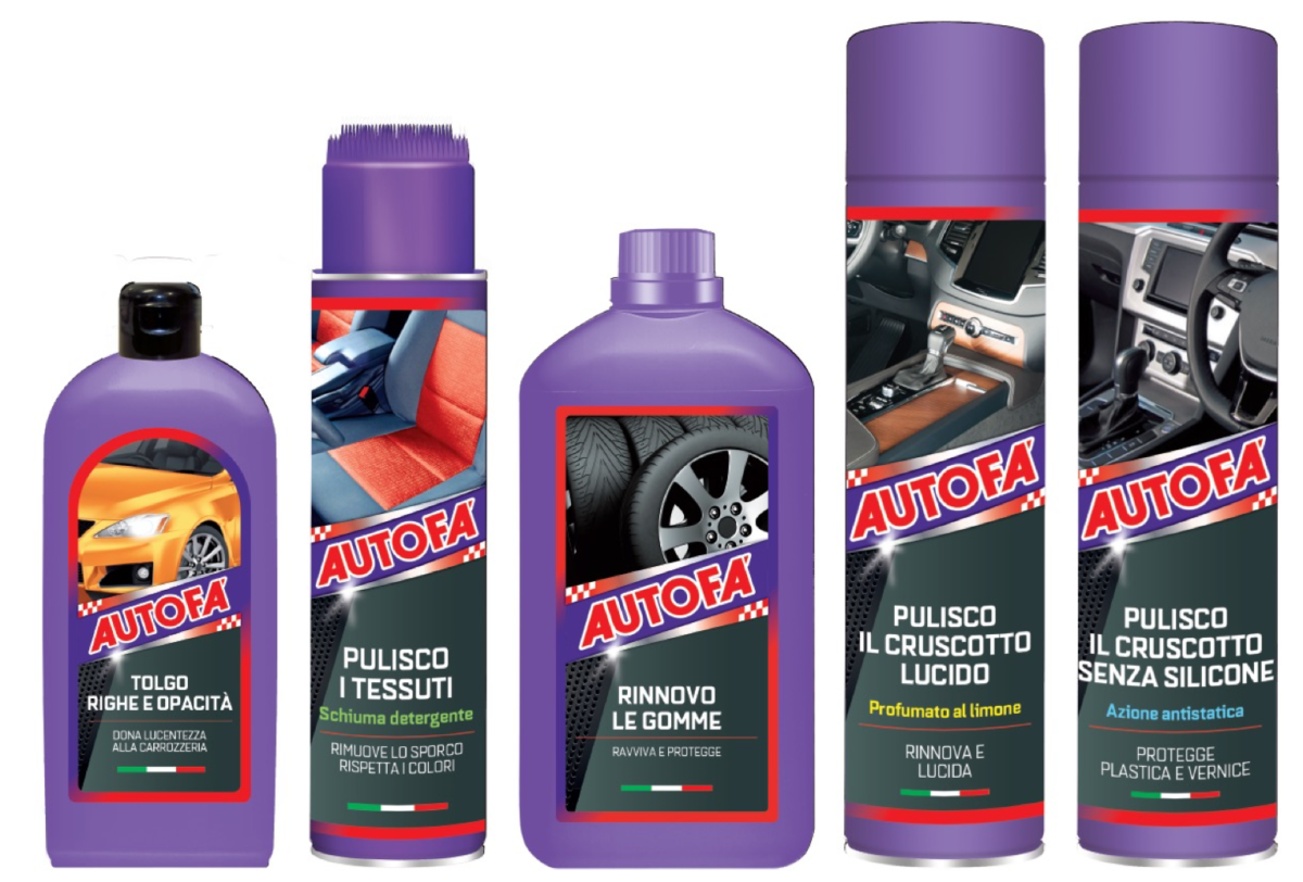 La gamma completa AUTOFÀ è composta da: Pulisco il Cruscotto (Lucido e Senza Silicone), Pulisco i Tessuti, Rinnovo le Gomme, Faccio lo Shampoo, Tolgo Righe e Opacità, Lavavetro Pronto Uso (0°C e -15°C), Lavavetro Concentrato (0°C e -60°C), Protettivo Radiatori (-20° +121°). Per ulteriori informazioni: www.arexons.it