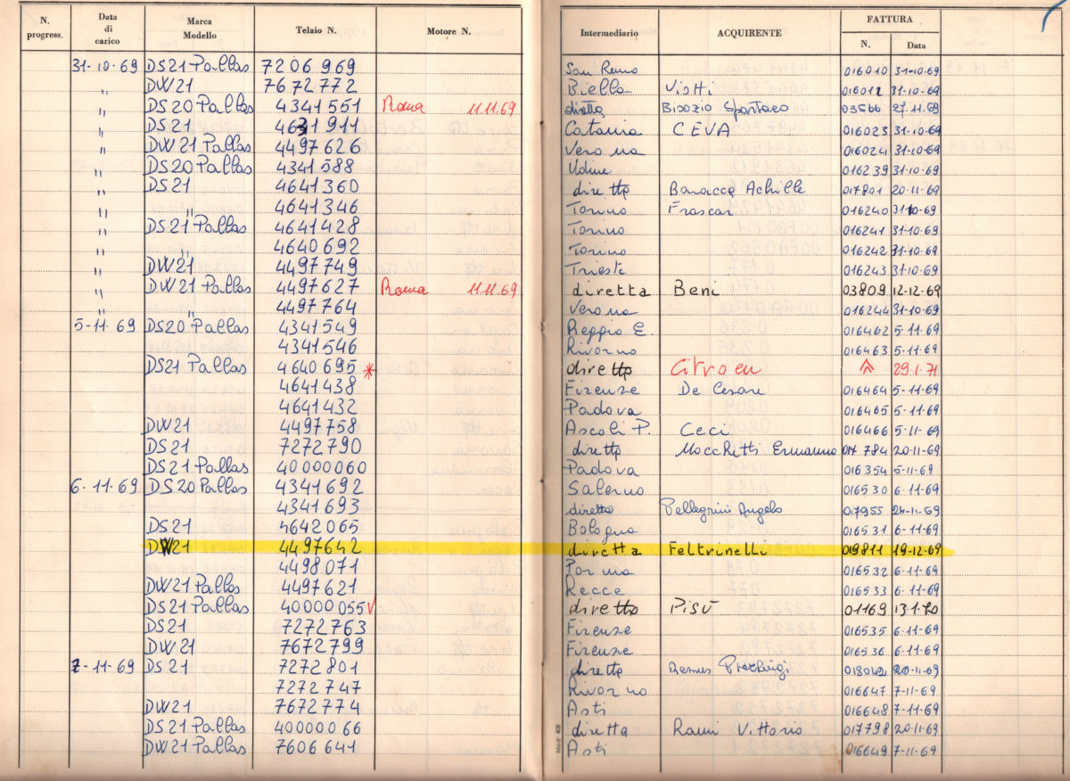 aramente restituiva a Citroën le sue DS al momento di acquistarne una nuova, spesso le conservava come seconda auto o le regalava, come quella che con tutta probabilità regalò al pittore Ligabue (una delle prime) che, privo di patente, la utilizzava con l’aiuto di un amico che faceva da autista o quella che donò a un suo collaboratore pochi mesi prima del suo “ingresso in clandestinità”.
