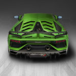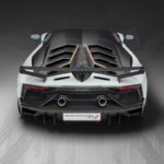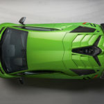 Lo splitter frontale scollegato dà l’impressione di fluttuare, fungendo al contempo da canale per il flusso d’aria. Una presa d’aria tridimensionale sul cofano indirizza il flusso d’aria, migliora sia la resistenza aerodinamica sia la deportanza e si presta chiaramente allo scopo aerodinamico del design della SVJ. L’ottimizzazione aerodinamica della parte superiore della carrozzeria ha contribuito per il 70% al miglioramento della deportanza totale nella SVJ rispetto alla SV. Il longherone della SVJ è completamente nuovo e presenta una forma a “Y” che ritroviamo nelle vetture Lamborghini e nelle forme tipiche degli aerei da caccia. Le prese d’aria laterali più grandi e le nuove alette sul lato anteriore riducono la resistenza aerodinamica e migliorano il raffreddamento complessivo. Il design aerodinamico migliorato del sottoscocca con generatori di vortici che lavorano insieme ai diffusori anteriori, e un diffusore posteriore completamente nuovo, dal design estremo e con pinne divergenti, contribuiscono per il 30% al miglioramento della deportanza totale. Lo spoiler posteriore della SVJ è stato progettato per ottenere la migliore efficienza aerodinamica. E’ stato messo a punto un nuovo profilo alare, un sistema ALA 2.0 ottimizzato e alette laterali per ridurre la turbolenza, fornendo al tempo stesso un’elevata deportanza sul rettilineo e nelle curve ad alta velocità.