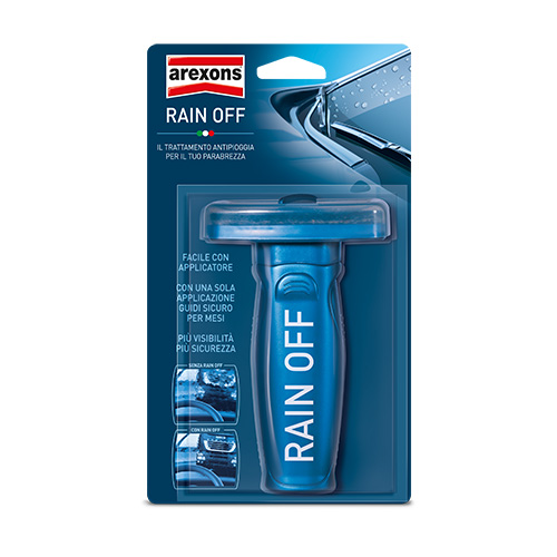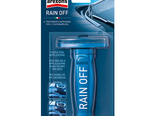 lo scivolamento delle gocce di pioggia già a 50/60 km orari. Grazie alla sua formulazione, RAIN OFF fa scorrere le gocce d’acqua senza farla aderire alla superficie: l’acqua condensa in goccioline che scivolano via all’aumentare della velocità del veicolo, lasciando il cristallo sempre pulito e trasparente. RAIN OFF è dotato di un pratico ed esclusivo applicatore che rende facile e immediata l’applicazione del prodotto. RAIN OFF è in vendita in confezione da 100 ml al prezzo consigliato di 9,70 euro. Per ulteriori informazioni: www.arexons.it