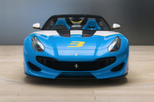 I richiami alla sportività sono sottolineati anche da dettagli unici come le aperture sul cofano che offrono una vista esclusiva del V12 da 780cv, l’ala trasversale che unisce le due pinne dietro i roll hoop in fibra di carbonio, e il tappo del serbatoio in alluminio spazzolato. I sedili sono rivestiti in pelle blu con un inserto bianco. La pelle blu è stata scelta anche per la parte bassa della plancia e per le cuciture a contrasto che impreziosiscono gli interni.