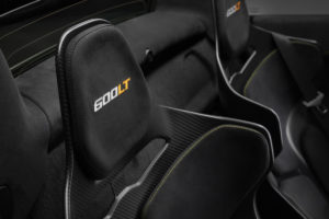 L’auto è creata utilizzando tutti pacchetti di fibra di carbonio disponibili, che includono MSO Defined Visual Carbon Fibre Front Fender Louvres, le “branchie” (“gilts”) che sono rapidamente diventate una delle opzioni più popolari per la 600LT. Un ulteriore omaggio alla 675LT, è rappresentato dagli elementi esterni in fibra di carbonio a vista con finitura satinata. L’hard-top retrattile MSO Bespoke è stato scelto in Carbon Black mentre i cerchi in lega leggera a 10 raggi presentano una finitura nero lucido. Il colore Napier Green è la scelta dal catalogo MSO Bespoke per le pinze dei freni e questo fornisce l’ispirazione per le cuciture a contrasto e l’inserto in colore a contrasto delle 12 sul volante. Esclusiva tra i modelli della serie Sports, la 600LT viene equipaggiata con sedili da corsa in fibra di carbonio ultraleggeri, sviluppati originariamente per la McLaren Senna.