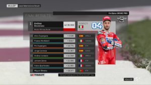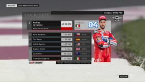 Il primo successo nella MotoGP 2019 sotto le luci del Qatar è firmato da Andrea Dovizioso (Mission Winnow Ducati) che batte per 23 millesimi Marc Marquez (Repsol Honda), in un arrivo-fotocopia di quello 2018. Protagonisti della gara anche Cal Crutchlow (LCR Honda Castrol) e un Valentino Rossi (Monster Energy Yamaha MotoGP) in grande rimonta, dopo essere partito dalla 14° posizione. Delusione invece per Maverick Viñales (Monster Energy Yamaha MotoGP), partito dalla pole ma poi fermato dal poco grip.