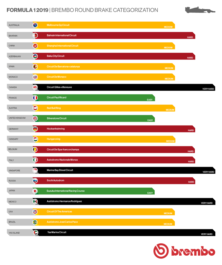 La maggior parte delle monoposto utilizzerà dischi da 32 mm di spessore all’anteriore e dischi da 28 mm al posteriore. A seconda delle temperature previste durante il singolo Gran Premio e della specifica strategia di gara, ciascun pilota potrà optare fra tre diverse soluzioni di dischi Brembo: prendendo come riferimento l’impianto anteriore si hanno l’opzione medium cooling con 800 fori, high cooling con 1.250 fori e very high cooling con 1.480 fori. Gli ingegneri Brembo stanno inoltre lavorando per fornire a tutti i team un’opzione di disco dal diametro più piccolo al posteriore, possibilità da utilizzare nei circuiti light e meno stressanti per l’impianto frenante, come Le Castellet o Silverstone, affinché si possano ottimizzare le performance del carbonio.