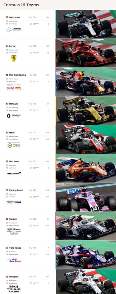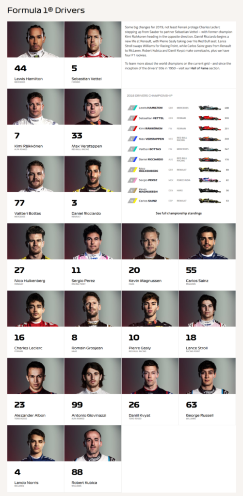 Tante le novità di questo 2019, a partire proprio dai piloti: tutti i riflettori saranno puntati sul nuovo acquisto Ferrari Charles Leclerc, con Kimi Raikkonen che gli cede il sedile per andare a occupare quello del monegasco in Alfa Romeo Racing, accanto al nostro Antonio Giovinazzi. Nuova vita per Daniel Ricciardo in Renault, con Pierre Gasly che va a prendere il suo posto in Red Bull accanto a Max Verstappen. Lance Stroll lascia la Williams per la Racing Point ovviamente, visto che del suo papà), mentre Carlos Sainz passa dalla Renault in McLaren, al posto del connazionale Fernando Alonso, che a fine 2018 ha deciso di lasciare la F1 (almeno per il momento…) e di dedicarsi ad altre categorie del motorsport. Tra i ritorni, attesissimo quello di Robert Kubica, in Williams, dopo 8 anni di forzata assenza dalla F1, mentre rivedremo Daniil Kvyat al volante della Scuderia Toro Rosso. Ma la F1 2019 passerà alla storia anche per il cambio generazionale, con l’arrivo di ben quattro rookies: Lando Norris in McLaren, Alexander Albon in Toro Rosso, Pierre Gasly in Red Bull e George Russell in Williams.