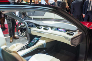 Italdesign ha esposto invece una futuristica consolle in Alcantara color beige che evidenzia i comandi della temperatura e altre funzionalità grazie a una retroilluminazione di luce bianca. Quasi come un tatuaggio sensoriale le icone disegnate si sfiorano e la retroilluminazione attivata dal contatto fornisce le informazioni al conducente, come un touch screen morbido al tatto.