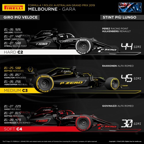 - MEDIUM C3: Secondo i dati raccolti venerdì, questa mescola era considerata la scelta migliore per il secondo stint, ma in gara la decisione se montare la mescola media o hard è stata più difficile (Ferrari, ad esempio, ha effettuato scelte diverse per i due piloti). Molti piloti hanno completato oltre 40 giri sulla media.