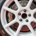Kit Sterrato – Il lavoro di sviluppo ha interessato anche il set-up della vettura per i percorsi su terra, con la creazione di un apposito kit che comprende tutte le componenti necessarie ad affrontare questo tipo di fondo. Per lo sterrato è oggi disponibile un apposito kit che prevede l’aumento dell’altezza da terra di 40 mm, con conseguente incremento della corsa delle sospensioni, necessaria per mantenere costante il contatto degli pneumatici anche sui fondi più accidentati e per una migliore trazione e tenuta di strada. Il kit per lo sterrato comprende anche dischi freno compatibili con i cerchi in lega specifici da 15″ (al posto del 18″ previsti per l’asfalto) per ridurre le masse non sospese con ottimizzazione dell’aderenza su terreni particolarmente sconnessi. I pneumatici sia da asfalto sia da sterrato sono della stessa misura del regolamento della categoria R5 (e WRC) in modo da poter usufruire dell’ampio range di mescole commercialmente disponibili.