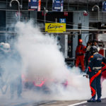 Dopo una mezz’ora dedicata agli scatti in pista mi sono diretto in pitlane per concentrarmi sui cambi pilota, un momento molto adrenalinico del weekend. Per realizzare queste immagini anche noi fotografi dobbiamo indossare sia un caschetto protettivo sia la tuta ignifuga, la stessa che hanno anche i piloti. Monza ha i box molto stretti rispetto ad altri autodromi e l’alto numero di vetture rende molto complicato il compito di tutti gli addetti ai lavori. Bisogna avere occhi ovunque, una grande esperienza e restare concentrati su tutto quello che accade intorno a noi. Valutare il momento esatto e il posto corretto dove posizionarsi è fondamentale per non correre rischi eccessivi per realizzare le nostre foto. L’esperienza di questi anni fortunatamente mi ha aiutato a scattare buone fotografie senza intralciare il lavoro dei meccanici e dei piloti durante le delicate fasi dei pit stop.