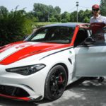 della monoposto, un’Alfa Romeo Giulia Quadrifoglio “Alfa Romeo Racing”, una serie speciale a tiratura limitata che rende omaggio ai colori del team e si arricchisce di esclusivi contenuti. Sono di serie infatti i sedili sportivi Sparco con cuciture rosse e guscio in carbonio, il pomello del cambio automatico con inserto in carbonio firmato da Mopar, il volante in pelle e Alcantara anche questo con inserti in carbonio. All’interno spicca poi un badge celebrativo dedicato con il logo Alfa Romeo Racing. Le emozioni della competizione ritornano nei dettagli tecnici come il tetto in carbonio a vista, i cerchi in lega bruniti da 19″ le pinze freno rosse. Inoltre questa serie speciale è dotata dell’esclusivo scarico in titanio Akrapovič, che enfatizza il sound profondo e aggressivo del motore 2.9 V6 Bi-Turbo, con un incremento di potenza di 10 CV. L’augurio per Antonio è che il Trofeo Bandini gli porti finalmente la fortuna che merita!