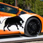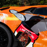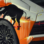 Skyler Grey ha utilizzato le principali tecniche della street art, tra cui l’uso di aerografi, pistole a spruzzo, rulli e stencil, con cui ha personalizzato la carrozzeria nel suo tipico stile pop e nei toni dell’arancio e giallo. Il colore di base in Arancio Atlas è stato la tela su cui Grey ha espresso tutta la sua creatività nell’interpretare il marchio Lamborghini. Il fondo si movimenta in tutte le sue parti esterne con pennellature decise e irregolari in giallo, arancio scuro e bianco, intervallate da schizzi di colore e colature di vernice realizzate con la tecnica del drip painting. La carrozzeria, caratterizzata così dall’alternanza di tre colori, è infine animata da immagini stilizzate di tori che corrono lungo la fiancata, raffigurati nella loro corsa in uscita da prese d’aria e dall’iconico barattolo di zuppa Campbell, quale citazione dell’opera di Warhol “32 Campbell’s Soup Cans”.