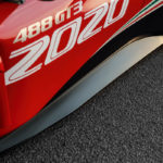 Nella realizzazione della versione Evo 2020 le principali aree di intervento hanno riguardato l’aerodinamica, la dinamica veicolo, l’ergonomia, la sicurezza e l’affidabilità pur rispettando i rigorosi limiti prestazionali imposti dal regolamento FIA in termini di potenza ed efficienza aerodinamica. L’obiettivo degli ingegneri che si sono occupati dell’evoluzione aerodinamica della 488 GT3 Evo 2020 è stato quello di garantire alla vettura una maggiore stabilità tramite una riprogettazione del frontale. Le oltre 18.000 ore di calcolo per le simulazioni CFD e le sessioni in galleria del vento hanno portato alla realizzazione di un nuovo paraurti che ora presenta una sezione frontale ridotta nella zona al di sotto dei proiettori. Questo ha consentito di alloggiare all’interno dei nuovi volumi una coppia di flick che generano un carico verticale più efficace, svolgendo una fondamentale funzione di stabilizzazione della vettura senza peraltro modificarne l’equilibrio aerodinamico, anche grazie all’intervento sui deviatori di flusso dello splitter. La rivisitazione dell’aerodinamica ha riguardato anche altre parti del frontale della 488 GT3 come le feritoie sopra il passaruota, che risultano ampliate rispetto al modello attuale; quelle posizionate posteriormente sono state invece completamente riprogettate, congiuntamente alla parte anteriore della porta, ulteriormente rastremata per una migliore canalizzazione dei flussi sulla fiancata.
