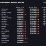 I piloti Ferrari e Mercedes partiranno domani sulle medium, così come Verstappen, mentre gli altri nella top 10 prenderanno il via sulle soft. Undicesima la Renault di Nico Hulkenberg, messo fuori dalla top 10 proprio dal compagno di squadra Ricciardo. Dodicesimo Kevin Magnussen sulla Haas, davanti alla Toro Rosso di Daniil Kvyat, cui è stato tolto il tempo che l’aveva portato in 11° posizione per aver superato i limiti della pista. Quattordicesima la Racing Point di Lance Stroll davanti alla Haas di Romain Grosjean. Fuori in Q1 le Alfa Romeo di Antonio Giovinazzi e Kimi Raikkonen, in 16° e 17° posizione, seguiti dalla Williams di George Russell. A chiudere lo schieramento la Racing Point di Sergio Perez – che dovrà partire dalla pitlane per non essersi fermato al peso nelle seconde libere – e la Williams di Robert Kubica.