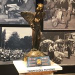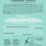 e suggestioni e le emozioni si succedono lungo il percorso di visita, in un’alternanza di momenti che ci ricollegano agli anni del boom economico, del jazz, dell’entusiasmo di stare insieme, della beat generation, del rock and roll, della libertà di muoversi e di viaggiare, della nouvelle vogue, dei grandi fotografi e della pubblicità d’autore, dove in questi temi, ogni spettatore può ritrovare il suo vissuto interpretato nei luoghi che hanno fatto dell’Italia il paese dell’arte e della bellezza. Così, insieme ai gonfaloni storici di rappresentanza quali orgoglio di appartenenza, troviamo i rari trofei dei raduni, delle attività sportive e turistiche: uno fra tutti il leggendario Trofeo del Turismo, pezzo unico, assegnato annualmente dal 1950 al ‘69 al Vespa Club che nel corso dell’annata aveva svolto la maggiore attività turistica. Veniva consegnato temporaneamente per la durata di un anno e doveva essere restituito al Vespa Club d’Italia un mese prima del Congresso ordinario. All’atto della restituzione il Trofeo veniva sostituito con un esemplare ridotto che veniva conservato definitivamente nella sede del Vespa Club premiato.