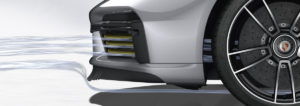 Lo spoiler anteriore attivo della 911 Turbo è stato oggetto di recenti ottimizzazioni sostanziali. L’area aerodinamica effettiva è stata ampliata rispetto al modello precedente. Le operazioni di estrazione e retrazione dello spoiler vengono effettuate più rapidamente e con minore pressione. I tre segmenti dello spoiler possono essere ‘aperti’ separatamente per mezzo di attuatori. I due attuatori esterni funzionano sempre in modo sincrono. Lo spoiler anteriore è realizzato in plastica flessibile (elastomero) e può quindi ruotare in modo tale da consentire l’estrazione o la retrazione del segmento centrale quando i segmenti esterni sono estesi. Sono possibili numerose regolazioni: