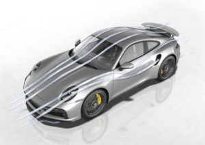 Le ottimizzazioni non si limitano a soddisfare esigenze specifiche durante la guida, ma riguardano anche le proprietà aerodinamiche in quanto tali: l’alettone posteriore e lo spoiler anteriore attivo di nuova concezione aumentano del 15% la forza deportante, garantendo maggiore stabilità e caratteristiche dinamiche superiori a velocità più elevate. La deportanza massima in posizione Performance (modalità Sport Plus attivata) è ora di circa 170 kg. Il coefficiente aerodinamico (cx) della 911 Turbo S varia in base alla regolazione aerodinamica. La configurazione più efficiente con cx minimo di 0.33 richiede che le alette siano chiuse e gli spoiler anteriore e posteriore retratti.
