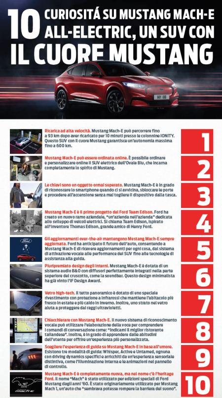 Mustang Mach-E, il SUV con il cuore Mustang, incarna completamente lo spirito della muscle car dell’Ovale Blu, con le sue linee eleganti e le curve muscolose, abbinate a un’esperienza di guida adrenalinica dai driving dynamics unici e inconfondibili, esaltato da tecnologie di infotainment e connettività di ultima generazione. Abbiamo raccolto 10 elementi distintivi che la caratterizzano in un’infografica dedicata. Pronti a scoprirli?