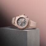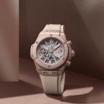 La cassa da 42 mm è una dichiarazione di stile: è realizzata in leggero alluminio moderno, un materiale unisex monocromatico, anodizzato e satinato, declinato nella colorazione Millennial Pink. Questa sapiente realizzazione tecnica è stata possibile grazie alla ricerca svolta dagli ingegneri di Hublot. Il colore, così specifico, è stato ottenuto attraverso l’anodizzazione, un processo che protegge e decora, e al contempo ha il vantaggio di conferire alla cassa e ai componenti la tonalità pastello desiderata unita a una straordinaria resistenza a graffi e urti. Le proporzioni assicurano una perfetta vestibilità al polso. No Gender. Il movimento di manifattura Unico, con una riserva di carica di 72 ore, vanta un meccanismo cronografico al lato del quadrante e una ruota a colonne.