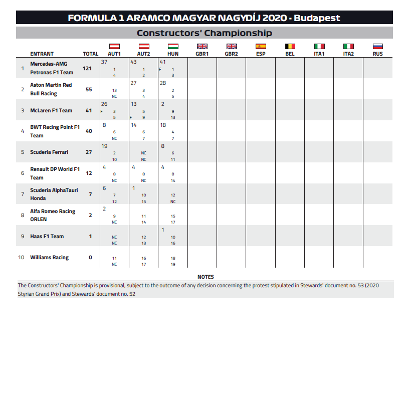 Quarta, ma a più di 57 secondi, la Racing Point di Lance Stroll, partito terzo. Quinta la Red Bull di Alex Albon che, partito 13°, è riuscito a passare Sebastian Vettel nelle fasi conclusive della gara, anche se la sua posizione è in forse per una investigazione della FIA: i meccanici hanno infatti asciugato la pista coi soffiatori prima della partenza, cosa proibita.