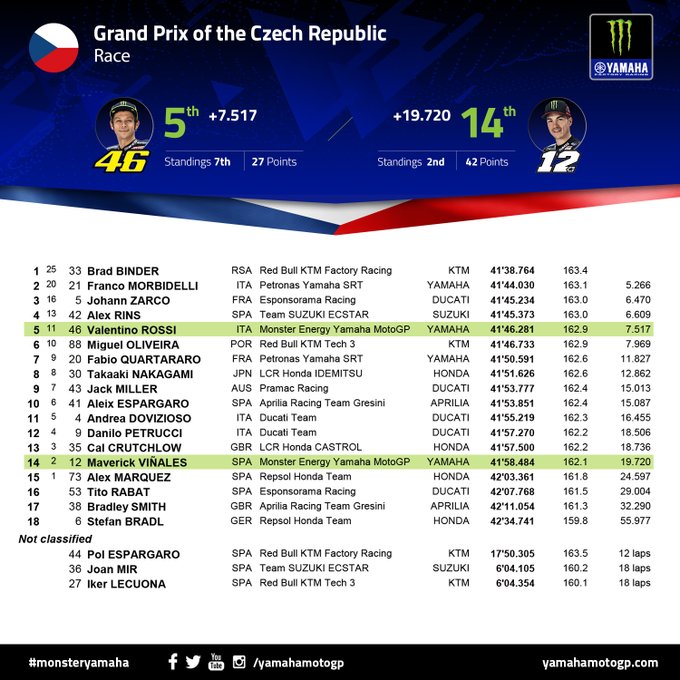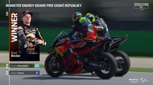 A tre giri dalla fine, Binder ha quasi quattro secondi di vantaggio su Morbidelli che consolida la seconda piazza davanti a Zarco. La domenica del Monster Energy Grand Prix České republiky è un appuntamento indimenticabile per la KTM che vede Oliveira tagliare il traguardo in sesta posizione alle spalle di Rossi, quinto dopo essere scattato dalla decima casella. È eccezionale il quarto posto di Rins che, ricordiamo, è in pista con una spalla slogata ma non per questo si tira indietro e fino agli ultimi metri di pista disponibili prova a prendere la terza posizione a Zarco.