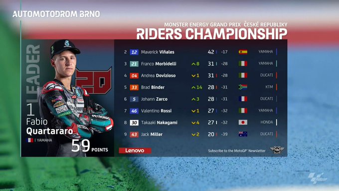 La KTM si prepara un ruolo sempre più da protagonista a Brno. Oltre al sudafricano impegnato in seconda piazza, anche Miguel Oliveira (Red Bull KTM Tech 3) è settimo un ritmo sostenuto. Ci pensa ancora una volta Binder ad attirare l’attenzione. Al 13° giro il sudafricano approfitta di un ingresso in curva largo di Morbidelli per portarsi in testa alla corsa iniziando la sua fuga. Intanto a Zarco viene comunicato il long lap penalty dopo il contatto con Pol Espargaro, il francese era in terza posizione e, nonostante la penalità, riesce a mantenere la posizione anche se così aumenta il distacco da Morbido. Rins, quinto, prova un sorpasso su Quartararo mentre alle loro spalle c’è Rossi in agguato. El Diablo viene superato da Rins, Rossi e Oliveira terminando la gara al settimo posto.