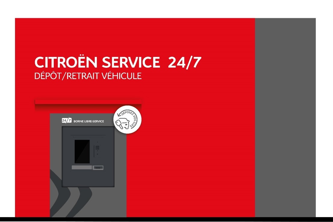 CITROËN Service 24/7 permette al cliente, per le operazioni di manutenzione ordinaria, di depositare e di ritirare il proprio veicolo 24 ore su 24, 7 giorni su 7, utilizzando uno sportello automatico completamente sicuro. La chiave del veicolo e il certificato di circolazione si lasciano allo sportello, mentre il pagamento del servizio si effettua online. Una volta conclusa la prestazione, il cliente viene avvisato via SMS e può tornare a ritirare la chiave e i documenti allo stesso sportello in qualsiasi momento, e quindi ripartire con la propria auto, che troverà posteggiata in un parcheggio riservato. Risultato: una nuova esperienza in concessionaria, semplice e senza costi aggiuntivi, che libera il cliente da qualsiasi vincolo di orario e semplifica la sua vita, garantendo la stessa qualità del servizio con l’accettazione tradizionale in officina.