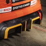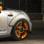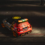 La MINI Electric Pacesetter ispirata al modello John Cooper Works mostra una figura estremamente dinamica anche lateralmente. L’interazione delle ghette geometricamente accentuate (con bordi aerodinamici accuratamente posizionati) e delle bandelle laterali sportive dona alla vettura un’impressione di movimento ancora prima di metterla in azione. Insieme alle ruote di diametro maggiorato, che quasi riempiono i passaruota, questi elementi rafforzano la consolidata “stance on the wheels” (posizione sulle ruote) di MINI. Le ghette e gli spoiler sono realizzati – o, più precisamente, stampati in 3D in fibra di carbonio riciclata – a Oxford. Le linee e le superfici con accenti gialli sugli elementi aerodinamici (ad esempio le ghette, le bandelle e l’ala posteriore) sono un rimando all’ottimizzazione del flusso aerodinamico che ha luogo in queste aree e aggiungono un tocco visivo ai deflettori d’aria e ai bordi aerodinamici. I leggeri cerchi forgiati da 18 pollici in design bicolore nero-neon/arancio apportano una significativa profondità visiva e una maggiore complessità agli elementi a quattro razze della MINI John Cooper Works GP.
