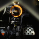 La parte posteriore in nero e Curbside Red met. utilizza superfici con accenti gialli per estendere il linguaggio di design accattivante dalla parte anteriore e dalle fiancate, delineando una figura estremamente moderna e dinamica. Il prominente alettone posteriore montato sul tetto con flusso d’aria e accenti in giallo integra anche il gruppo ottico di segnalazione ed è stato stampato in 3D presso lo stabilimento di Oxford. I passaruota svasati accentuano l’ampia carreggiata della vettura e la transizione senza interruzioni nella pronunciata grembialatura posteriore, che ha dei tagli intorno alle ruote, liberando la vista verso gli pneumatici da corsa ad alta aderenza. Tra le ruote si trova un diffusore disadorno. Quando si guarda l’auto da questa angolazione, gli accenti in Energetic Yellow e la mancanza di terminali di scarico la identificano subito come un’auto alimentata da un sistema di trazione elettrica.